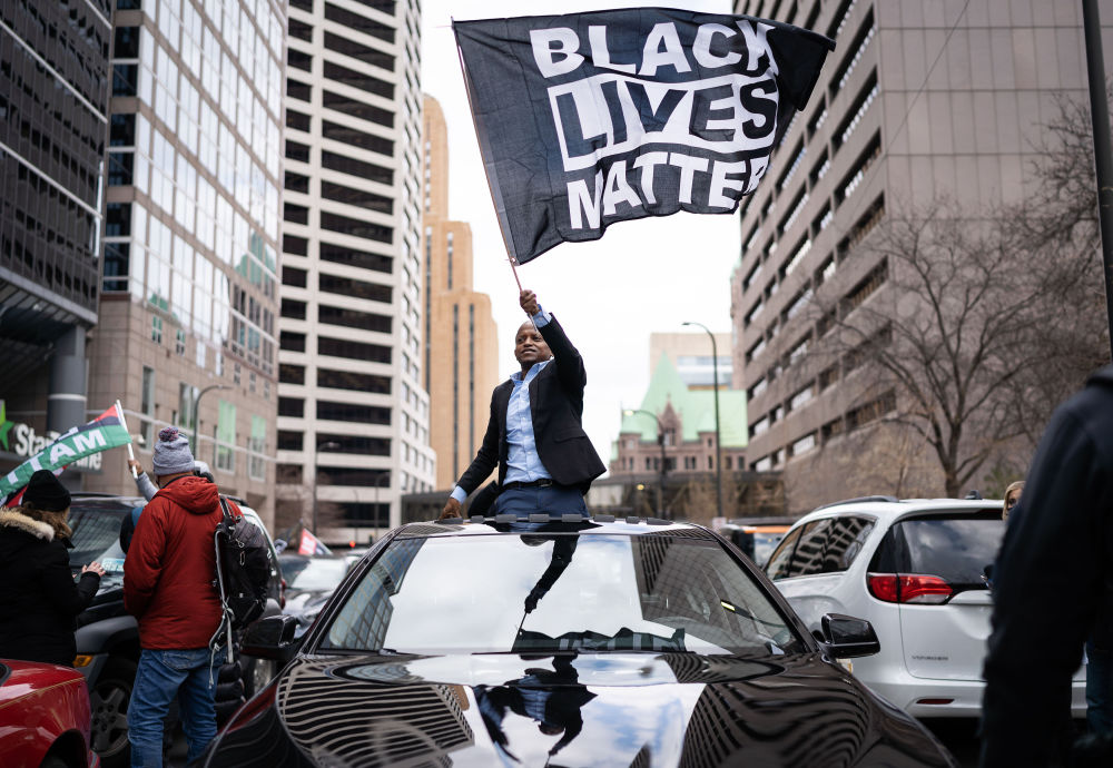 2021年4月20日,得知美国前白人警察德雷克·肖万被控的谋杀和过失杀人等三项罪名全部成立后,民众手举“黑人的命也是命”标语的旗帜聚集在美国明尼阿波利斯市的法庭附近。新华社发(本·布鲁尔摄)