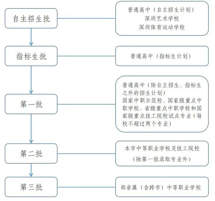 我市高中阶段学校录取共分五个批次,按照以下顺序依次进行:
