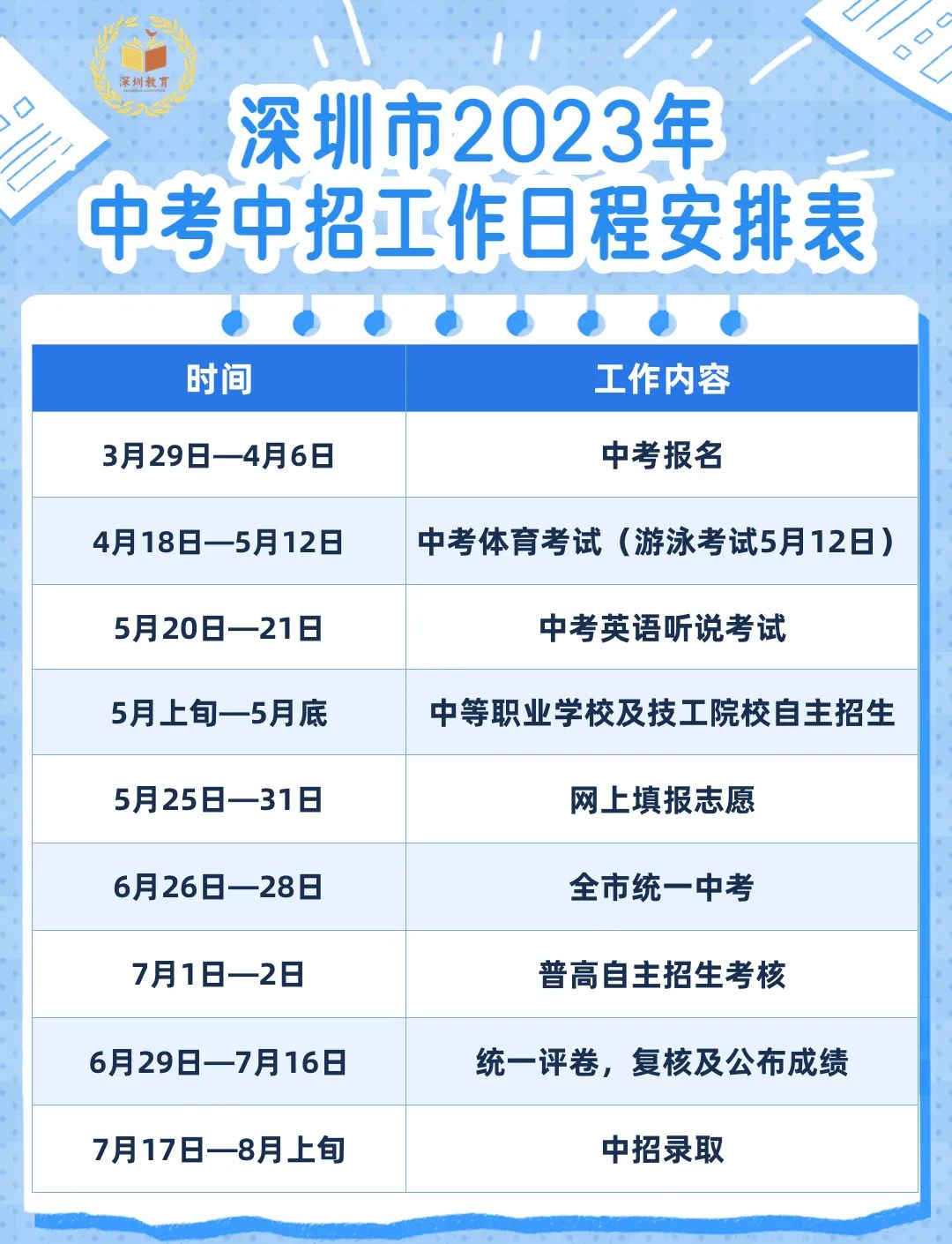 2023年深圳市中考报名时间为3月29日至4月6日,文化课考试时间为6月26日至28日,主要工作日程安排如下: