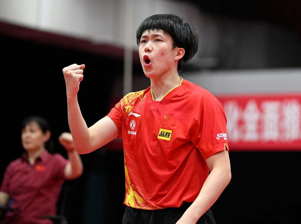 3月30日,王楚钦在比赛中庆祝得分。新华社记者 宋彦桦 摄