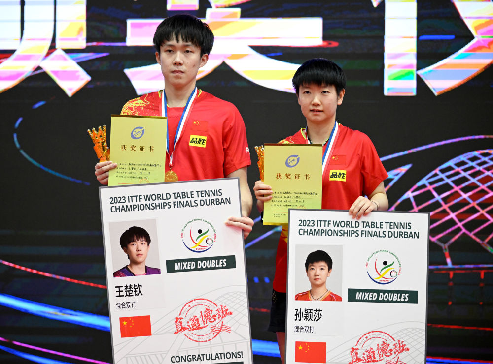 3月29日,本站冠军王楚钦(左)/孙颖莎在颁奖仪式上。新华社记者 宋彦桦 摄