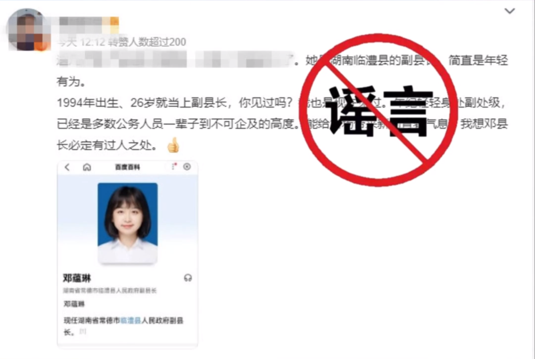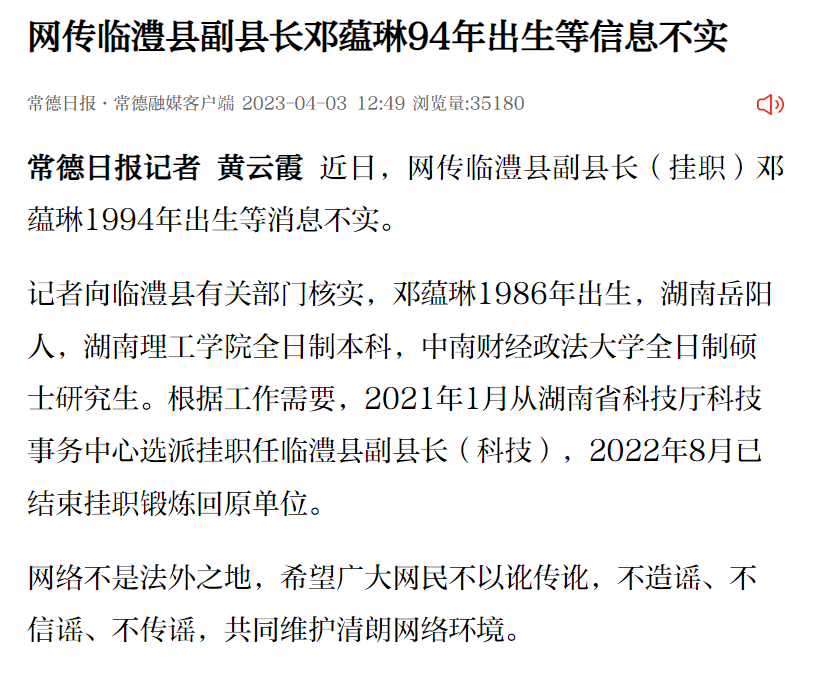 据常德融媒客户端消息,近日,网传湖南省常德市临澧县副县长(挂职)邓蕴琳1994年出生,记者向有关部门了解核实得知,网络传闻不实。