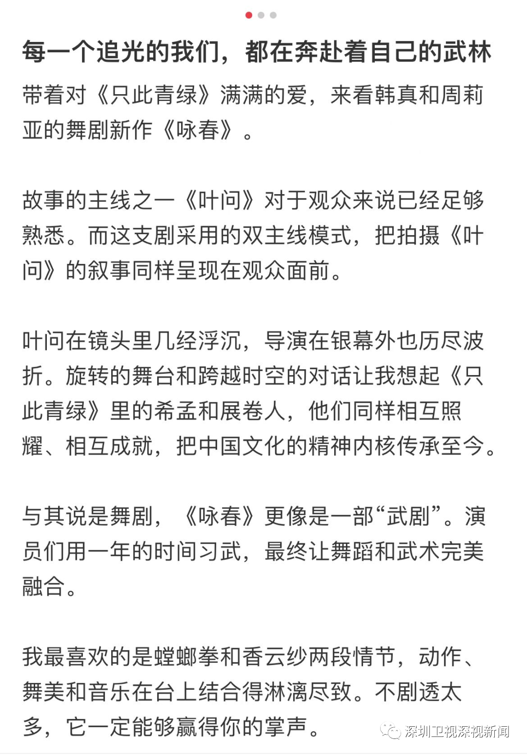 尤其是新浪微博、小红书等备受年轻人喜爱的社交平台,不少观众激动地当起了“自来水”,积极分享着自己的观剧感受。有的网友甚至发出如此感慨,“咏春,一部连眨眼都觉得是不尊重自己的舞剧。”