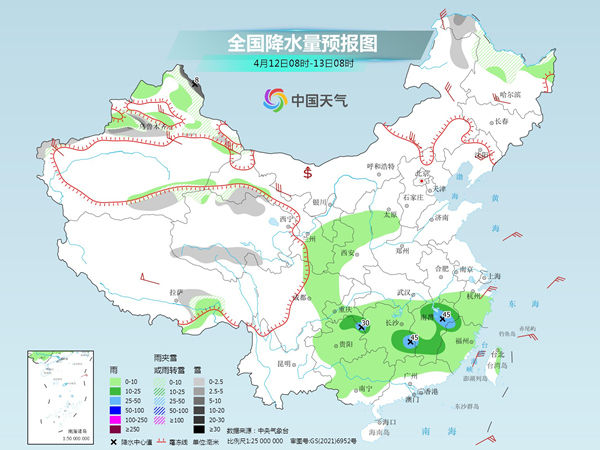 具体来看,中央气象台预计,今天新疆北疆北部和沿天山地区、西藏南部和东部、青海南部、内蒙古东北部、黑龙江北部等地部分地区有小到中雪或雨夹雪,其中,新疆阿勒泰北部和天山山区的高海拔地区、黑龙江西北部等地有大到暴雪(10~15毫米);新疆北疆和伊犁河谷、西藏东南部、四川大部、重庆南部、贵州大部、安徽南部、江苏南部、江南、广西、广东西部和北部、黑龙江东部、吉林东部等地部分地区有小到中雨,其中,广西东北部、广东西北部、江西东部、福建中部等地部分地区有大雨(25~40毫米)。