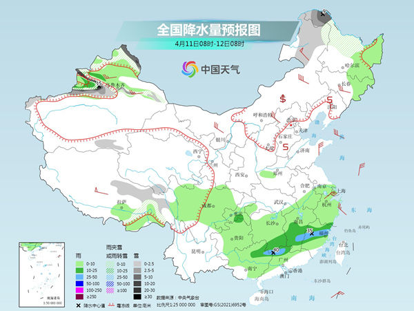 明天,新疆北疆北部和沿天山地区、内蒙古东北部、黑龙江北部、西藏南部、青海北部和南部、甘肃河西等地部分地区有小到中雪或雨夹雪,其中,新疆阿勒泰北部和天山山区的高海拔地区等地局地有大雪(5~8毫米);新疆北疆和伊犁河谷、西藏东南部、西北地区东部、西南地区东部、山西中部、江南、广西大部、广东北部等地部分地区有小到中雨,其中,湖南西北部和东南部、江西西部和东北部、福建西北部、重庆东南部、贵州东北部等地部分地区有大雨(25~45毫米)。