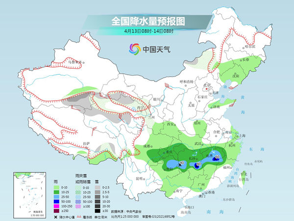 后天,新疆南疆盆地、西藏南部、内蒙古东部、青海中部和北部、甘肃东部和河西等地部分地区有小到中雪或雨夹雪;四川东南部、重庆大部、湖北南部、贵州北部、湖南中北部、江西中北部、福建西北部、安徽南部、浙江西南部等地部分地区有中到大雨,其中,湖南中部、江西中部等地部分地区有暴雨(50~80毫米)。