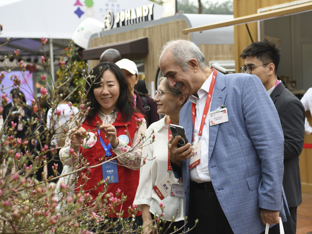4月8日,外国嘉宾在2023粤港澳大湾区花展现场赏花。新华社记者 梁旭 摄