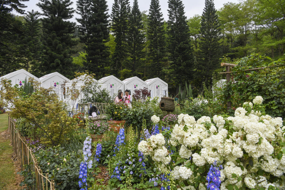 4月8日,观众在“海蒂的花园”里赏花、拍照。新华社记者 梁旭 摄