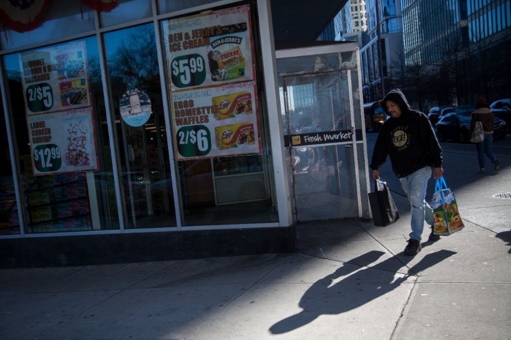 2月14日,在美国纽约市布鲁克林,一名男子从食品杂货店旁走过。新华社发(郭克摄)