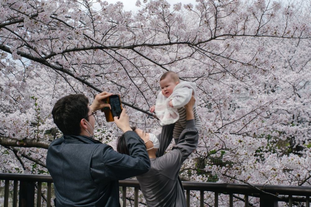 2022年3月30日,人们在日本东京目黑川沿岸的樱花树下拍照。新华社记者张笑宇摄