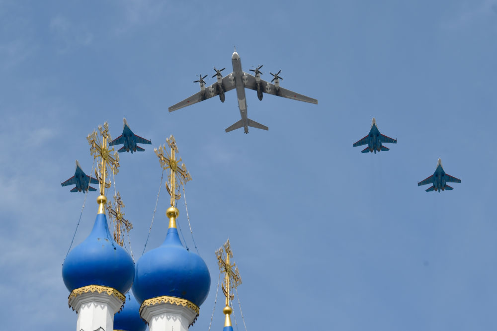 2022年5月7日,图-95MS战略轰炸机由四架苏-35S战斗机伴飞飞过俄罗斯莫斯科上空。新华社发(亚历山大摄)