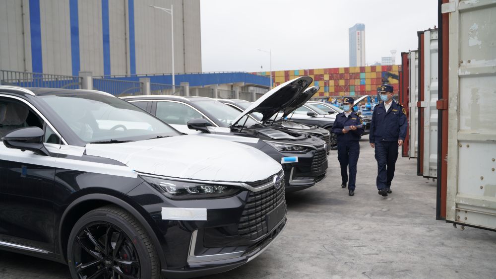 今年3月,在盐田港码头等待出口的电动载人汽车。(深圳海关供图)