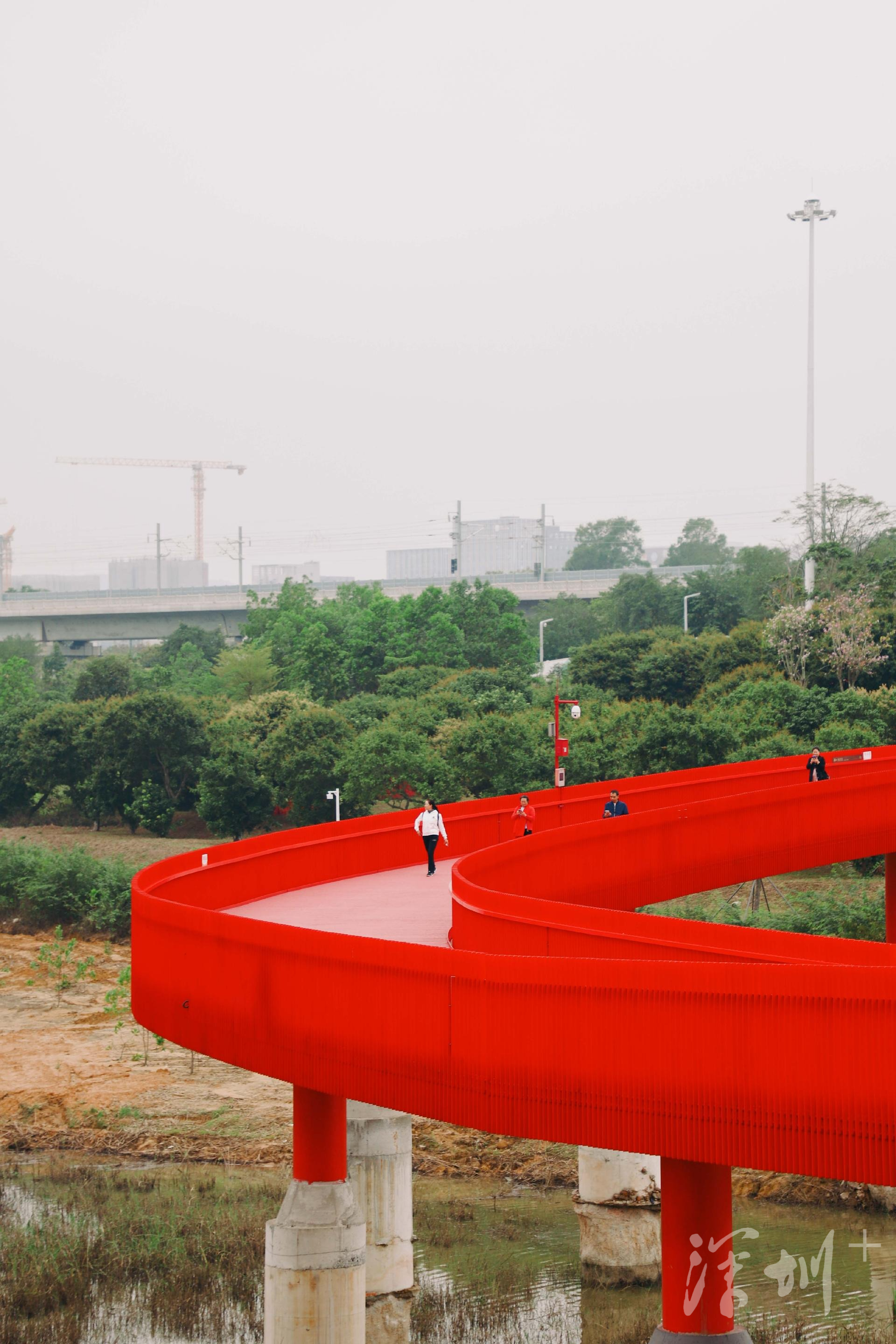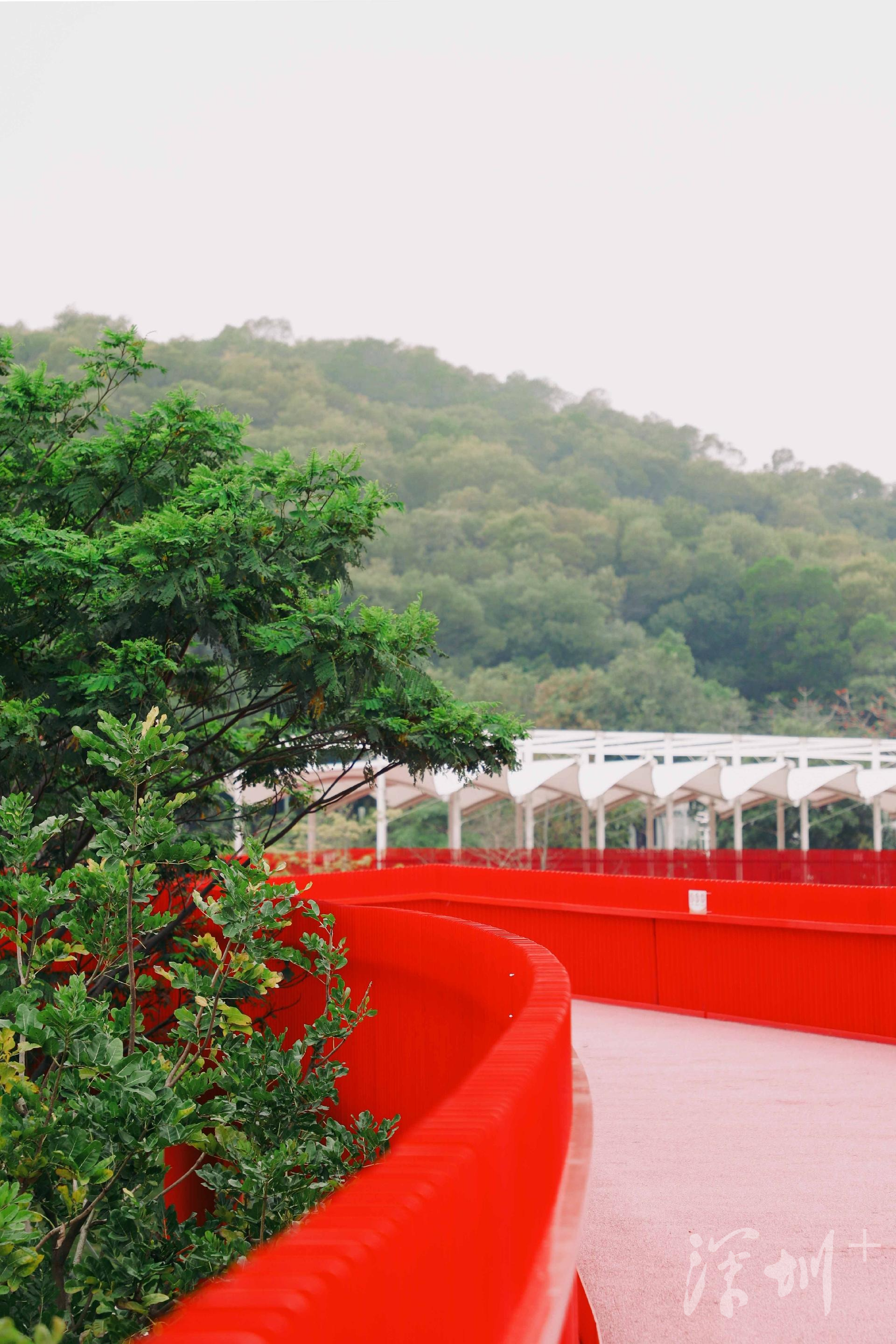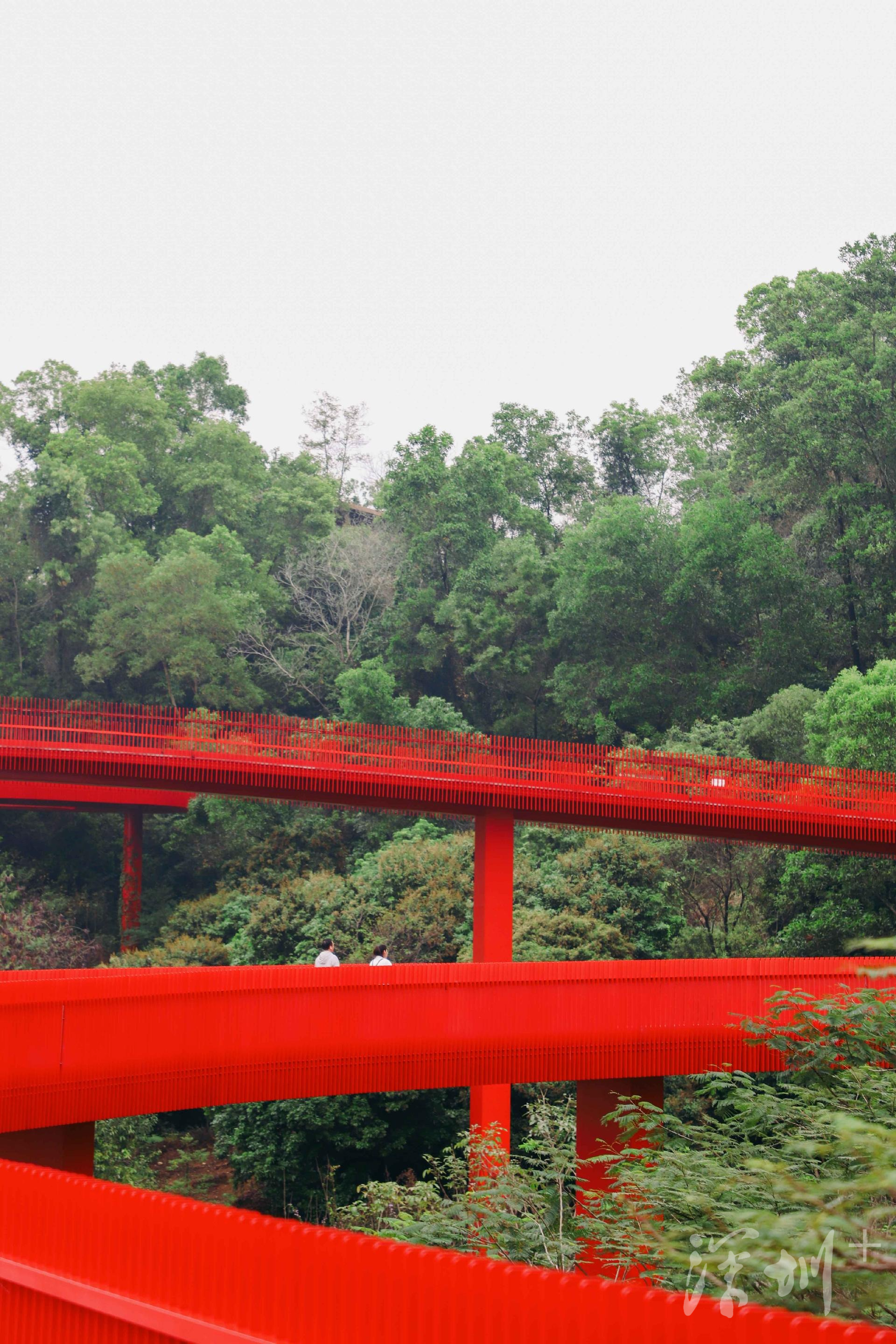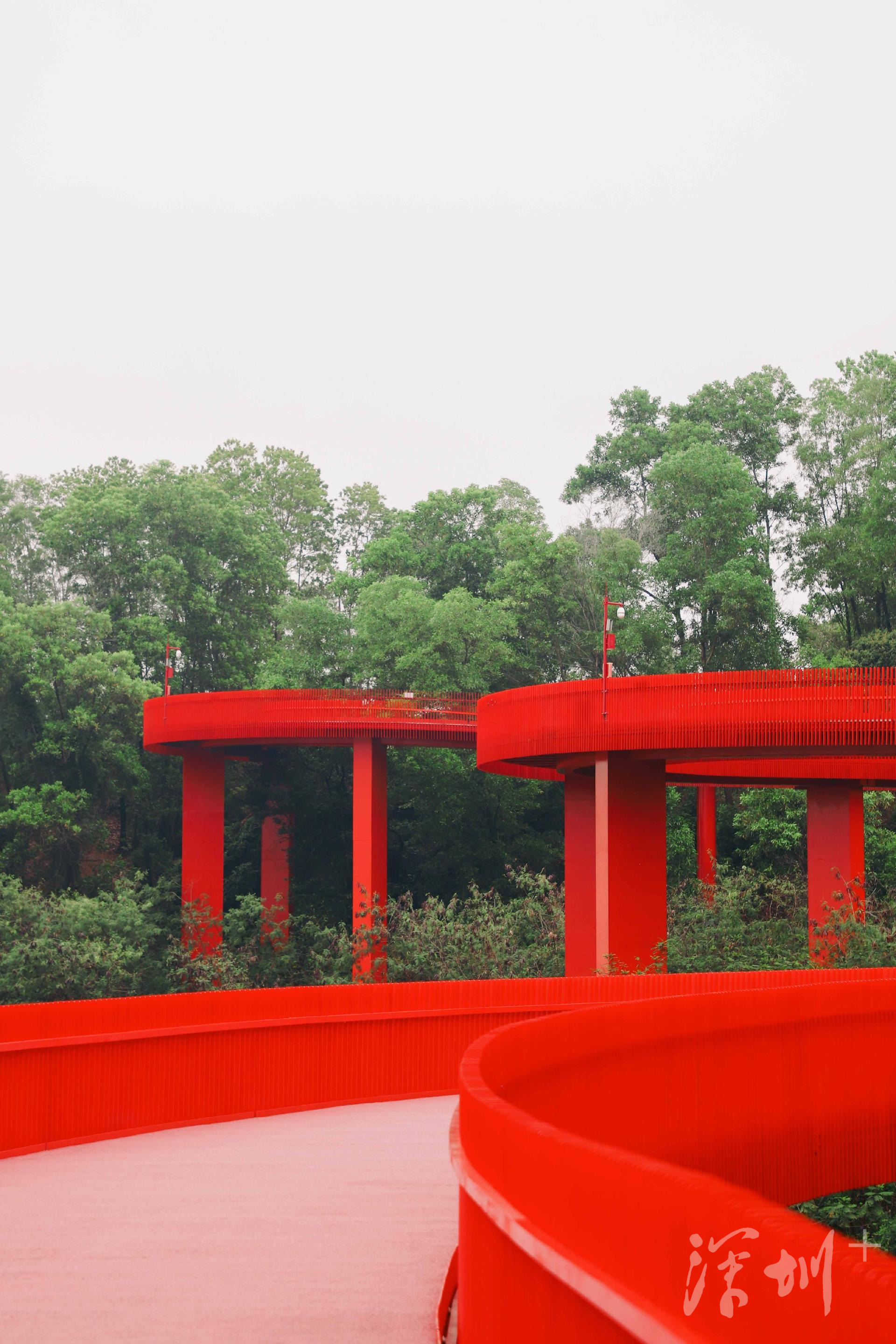 这是深圳最火的网红打卡地之一,有“光明红丝带”之称的虹桥公园空中栈桥。