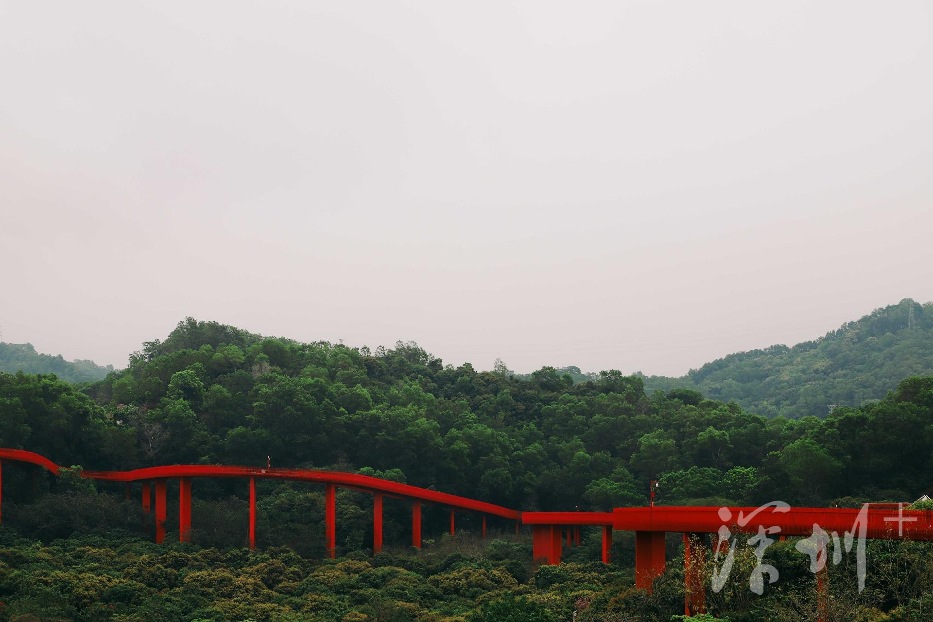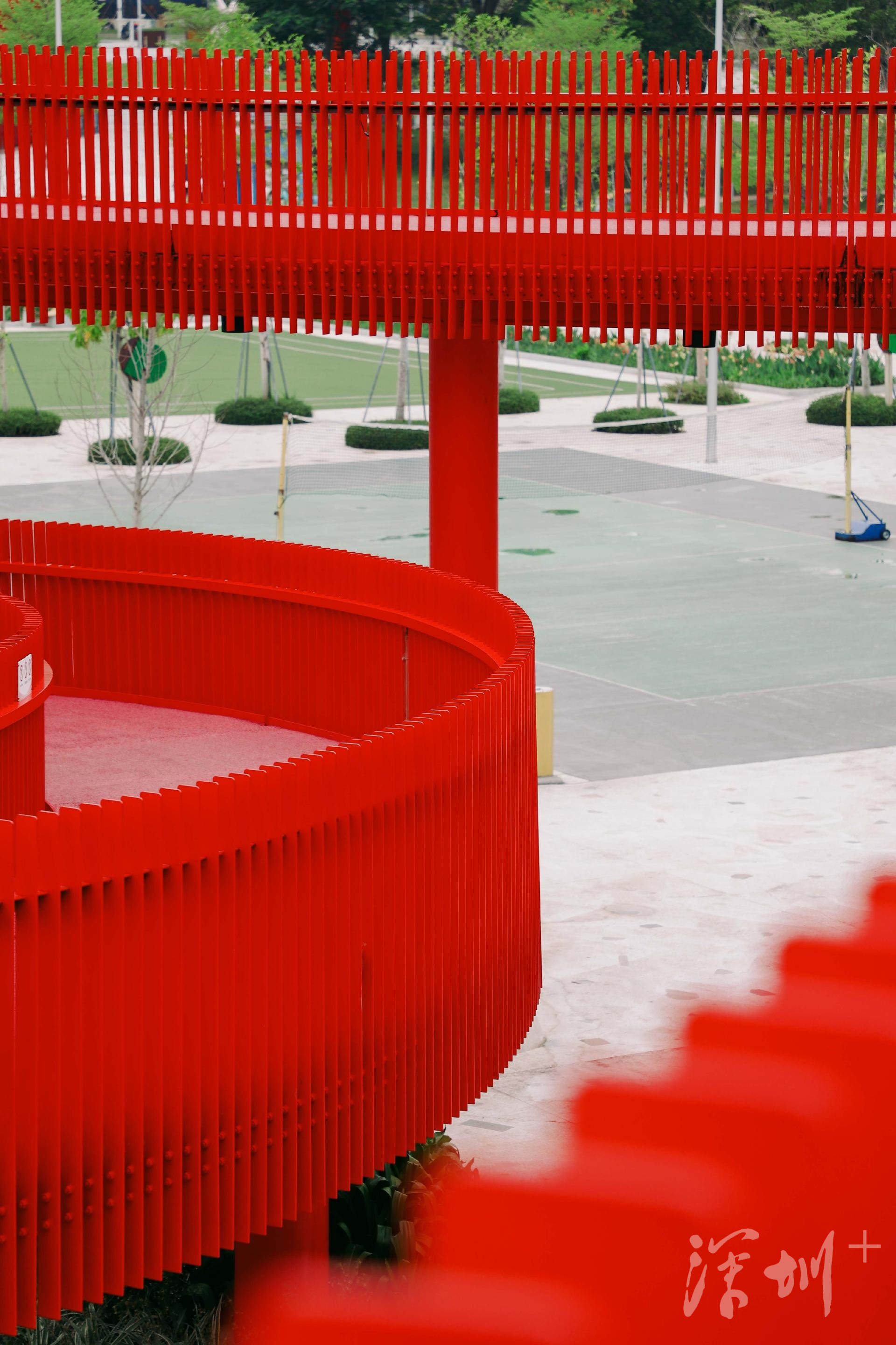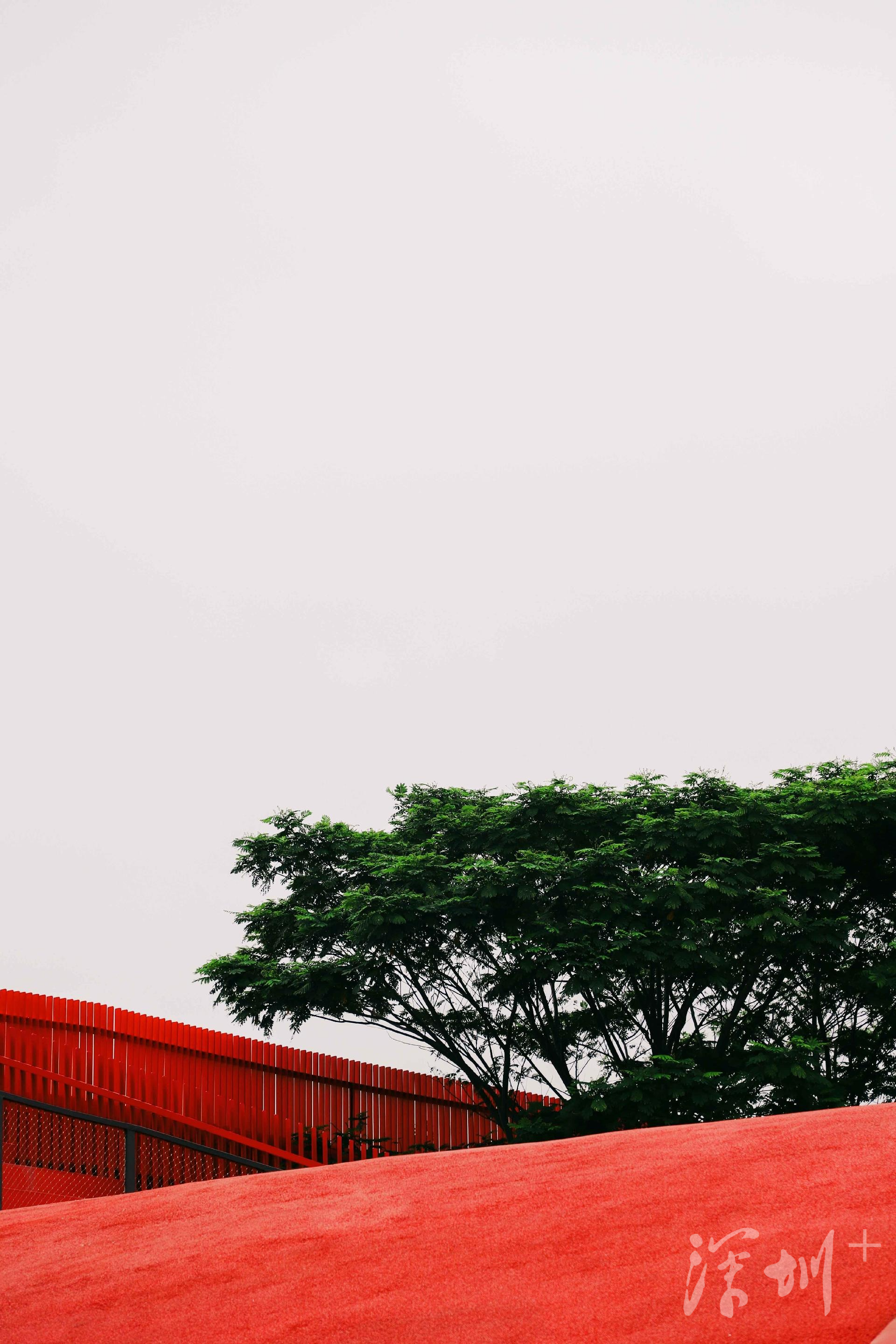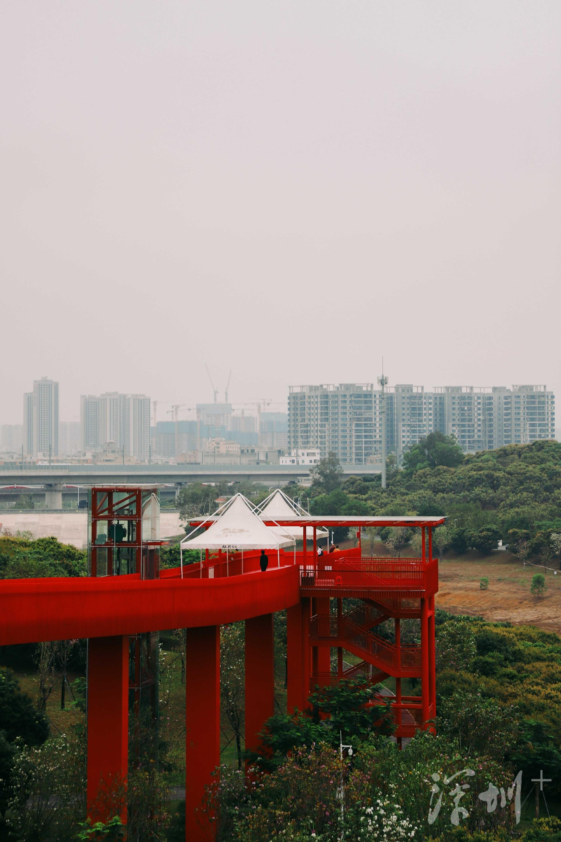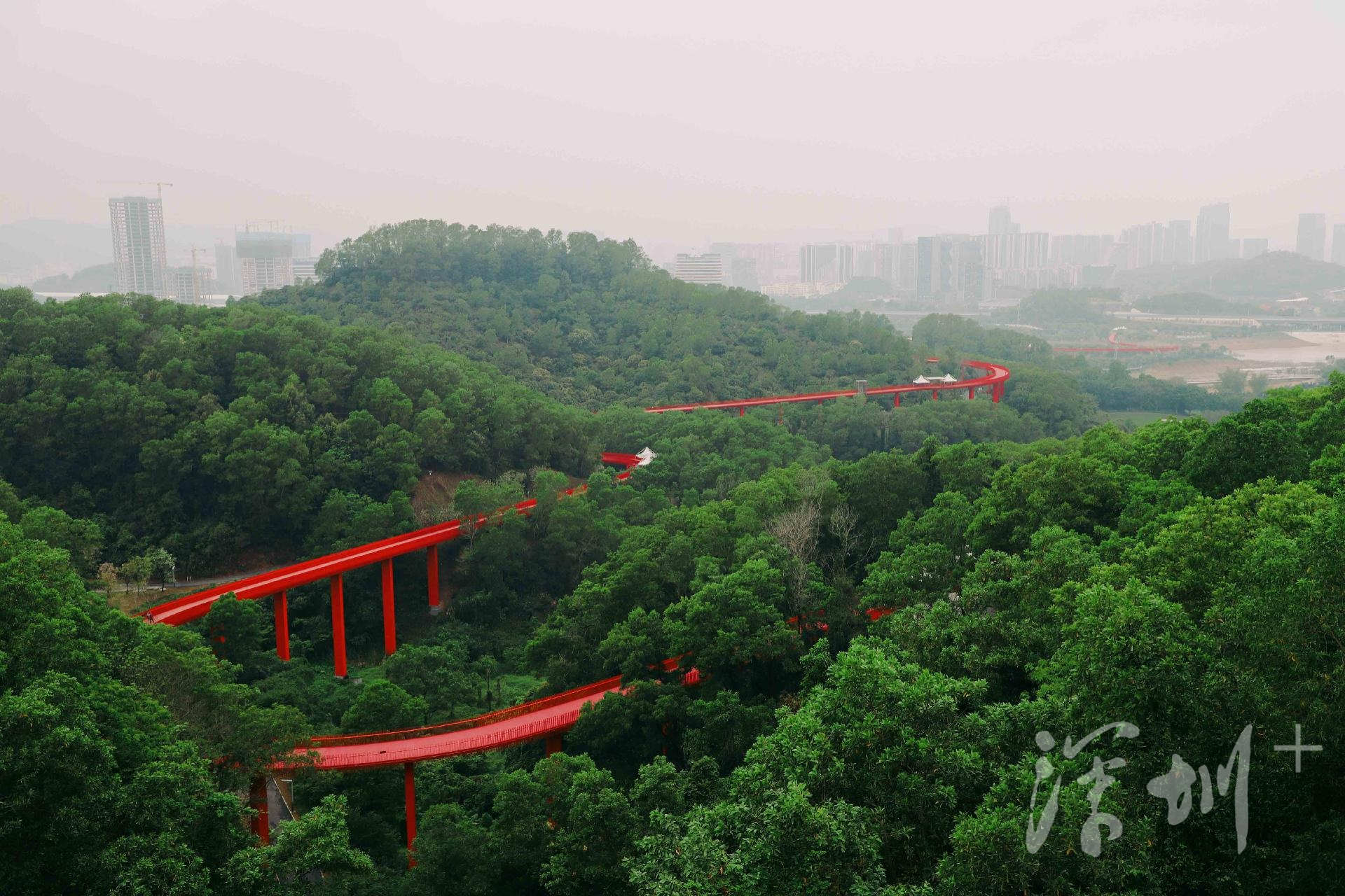 这是深圳最火的网红打卡地之一,有“光明红丝带”之称的虹桥公园空中栈桥。