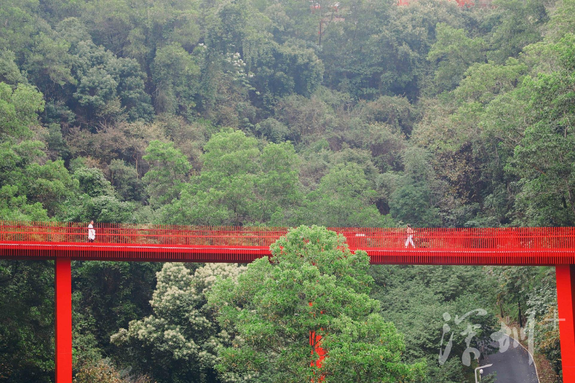 桥体纯正的中国红与森林层层叠叠浓稠的绿交相辉映,给人强烈的视觉冲击。