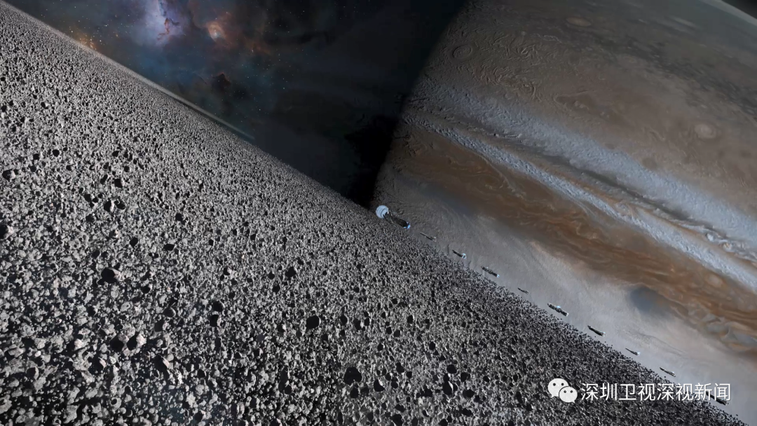 在影片的最后,音乐节奏突然变得紧张起来。舰队行驶到宇宙的“灾难层”,舰队停了下来,只有深圳这个“排头兵”一往无前冲了进去,扑面而来的陨石不断冲击着“深圳号”舰船。
