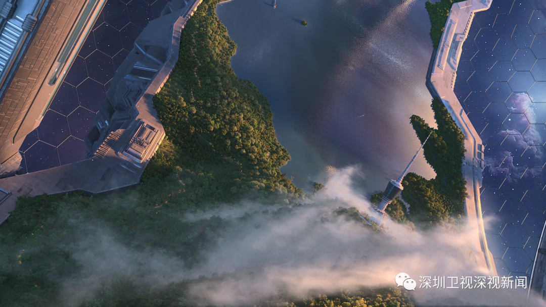 “大家认为最难的是特效,我认为最难的,其实是如何恰当地把这种科幻的元素,和深圳整个城市本体视觉上的神韵自然融合,相得益彰。”邓博弘说,团队相当于在太空重新规划了一个“深圳”,但视觉上依然和谐自然,既有熟悉感,又给人以想象空间。