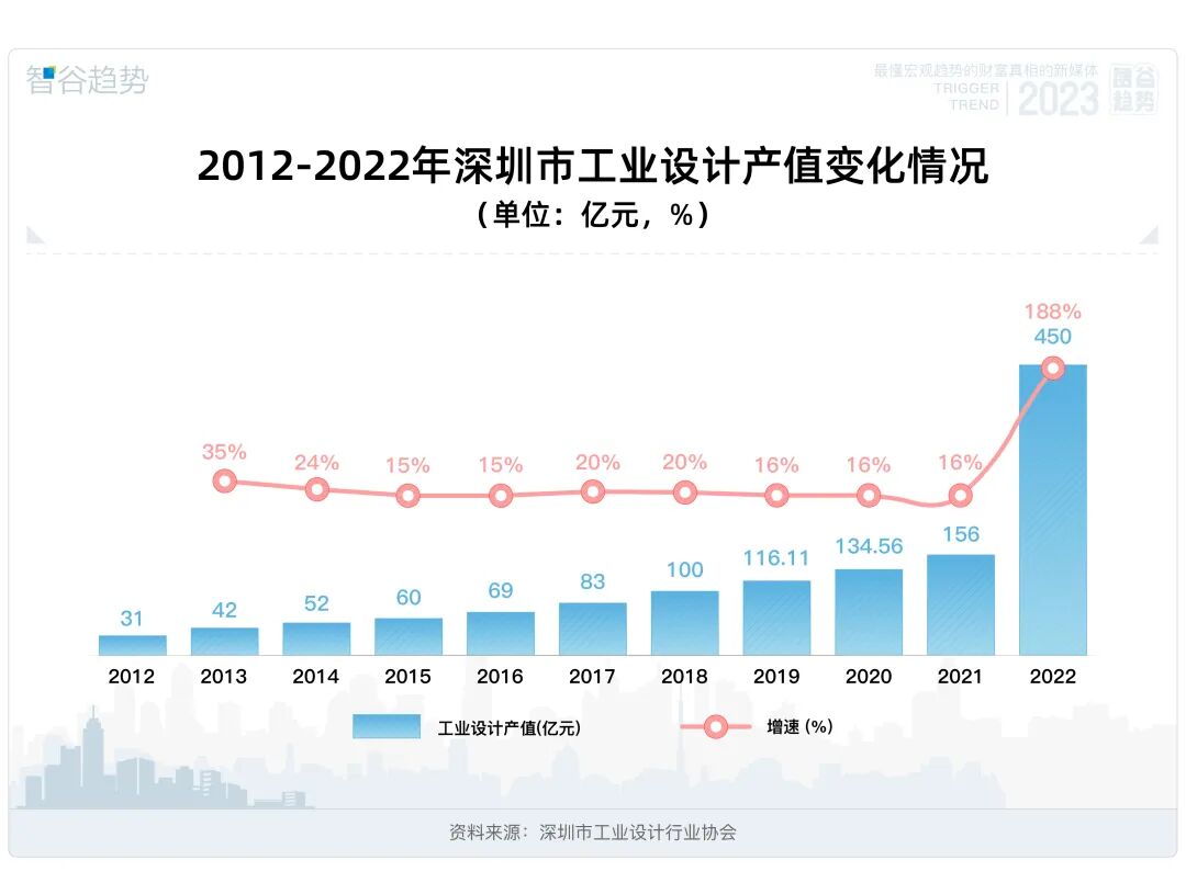 2022年,深圳工业生产与设计创新齐头并进,其工业设计总产值几乎较前一年翻倍,达450亿元,带动上下游产业产值超万亿。