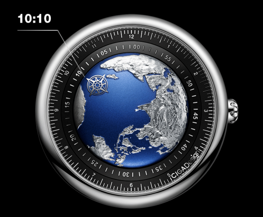这款手表从古代海图中撷取灵感,将读时的指针用航海标替代,通过蓝色星球模拟地球自转,彻底颠覆传统机芯齿轮比,实现了时针转30°,分针转390°。