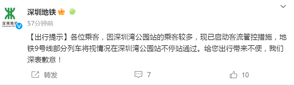 因深圳湾公园站的乘客较多已启动客流管控措施地铁9号线部分列车将视情况在深圳湾公园站不停站通过