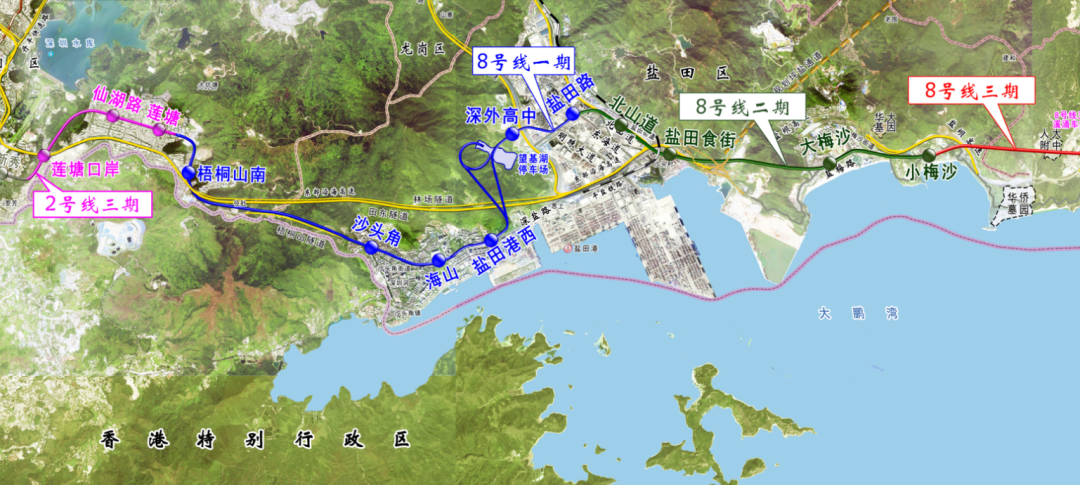 地铁8号线二期从8号线终点站盐田路站末端接出,东延至小梅沙,全长约8公里。全线采用地下敷设,包含四站四区间,均在盐田区内。