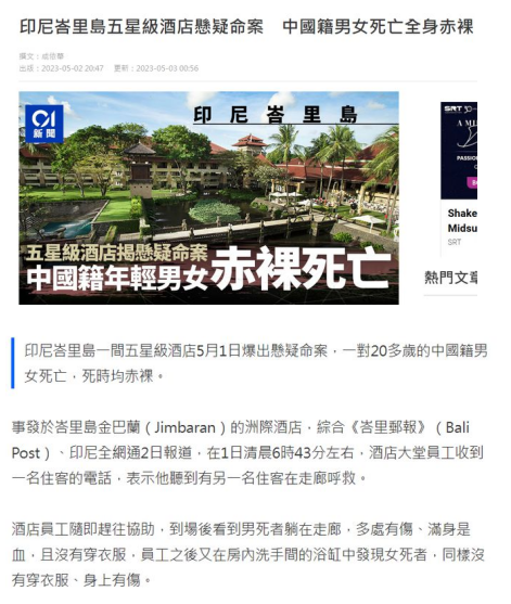 据多家当地媒体报道,5月1日,位于印尼巴厘岛的洲际酒店发生了一起命案,两名中国游客不幸身亡。