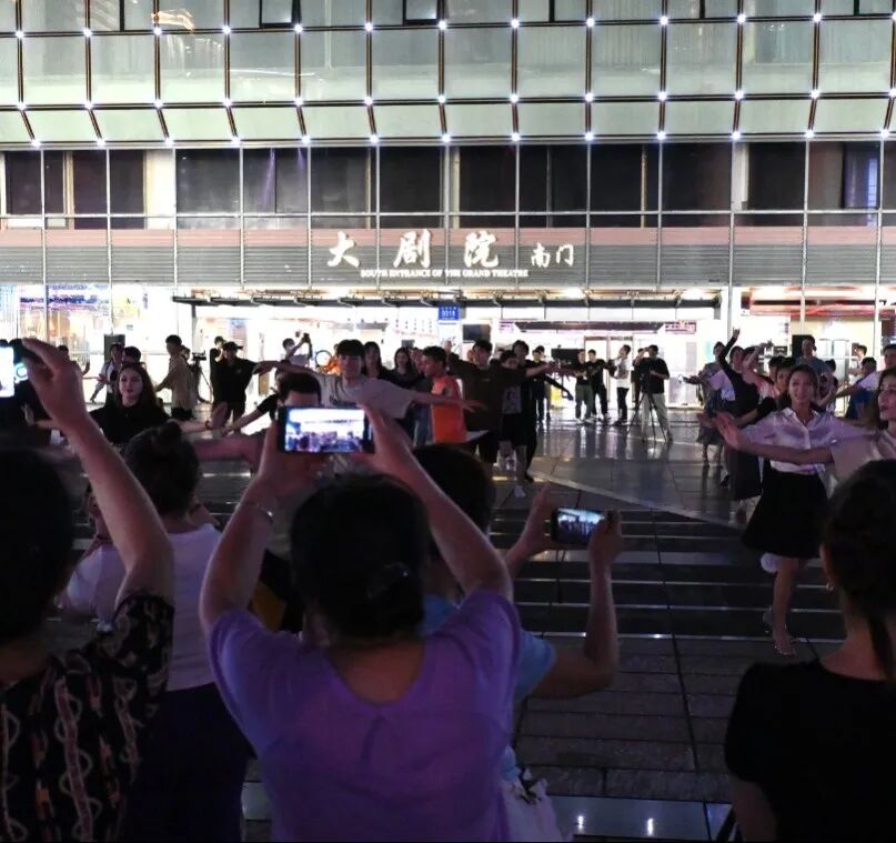 闻声而动,大家跟随歌曲《掀起你的盖头来》跳起欢快的麦西来甫。据悉,本次快闪活动由大型音舞诗画《掀起你的盖头来——新疆是个好地方》演出方组织、策划,希望通过“快闪”的方式,让深圳市民领略麦西来甫的魅力,感受到新疆人的热情。