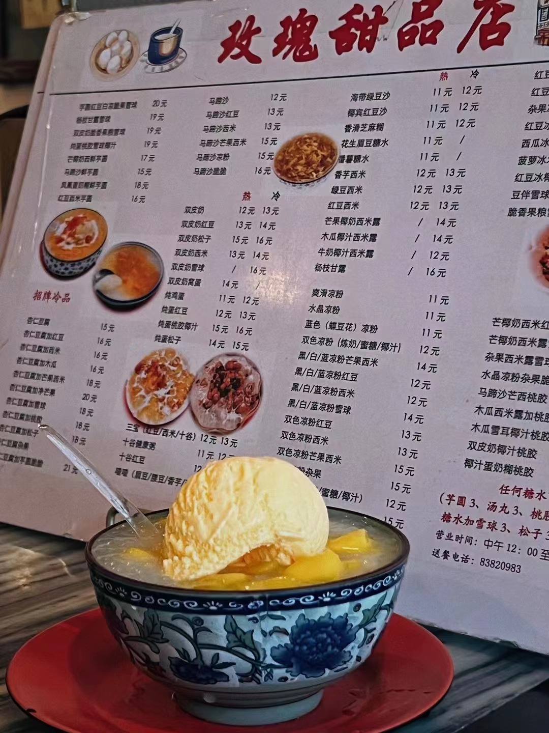 玫瑰甜品在人来人往的北京路上已经开了几十年了,成为融入当地人生活的老牌糖水店。店铺里供应的甜品品类繁多,超过一半的甜品可以选择做成热饮,每款糖水可自主选择添加雪球、桃胶、芋圆、芒果等小料。杏仁豆腐、蛋奶糊、杨枝甘露、双皮奶、芝麻糊等传统甜品非常受欢迎,一口下去,是小时候的味道没错了。