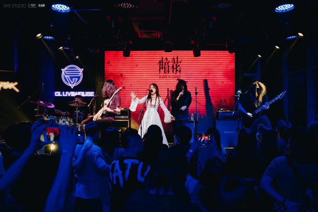 尽管工作繁忙,她也未曾放弃继续玩乐队。在音乐这条路上,她遇见了她的同行者——暗花乐队,2016年在广东河源成立的乐队组合。“当时看他们第一次演出时,感觉很扎实。而且他们玩的音乐和我喜欢的类型很契合。”暗花乐队的专辑中,有一首歌《荧光》特别打动她,宜佳向乐队自荐,试唱歌中的美声部分。“在参与了乐队的演出排练之后,发现双方合作体验非常好,就加入他们成了乐队主唱。”