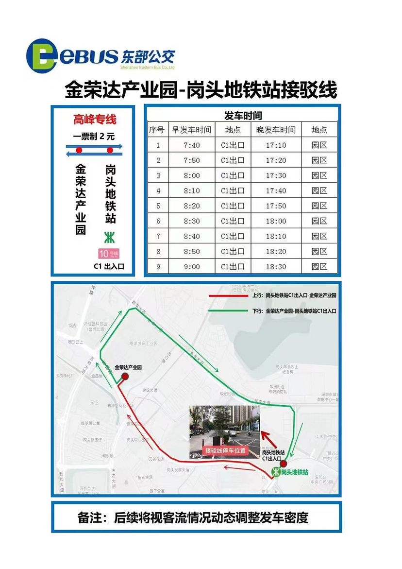 园区管委会主管程禄军经过调研企业发现,每天都有大量的企业员工上下班选择通过地铁出行,再通过步行或换乘公交的方式从岗头地铁站到达产业园,而这段距离如果步行则需要至少20分钟。了解到这一困难后,程主任第一时间与坂田街道办、东部公交运输有限公司取得联系,经过多轮方案提报,与东部公交共同制定了点对点开班计划,在工作日期间早高峰7:40一8:58,晚高峰17:50一19:07每间隔10分钟发一班次,票价2元。