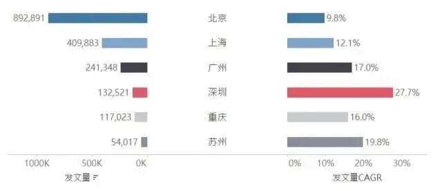 各城市学术产出规模和复合年均增长率(2018-2022)。