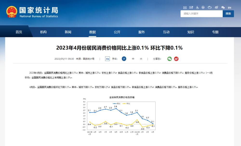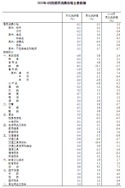 (原标题《国家统计局:2023年4月份居民消费价格同比上涨0.1%》)