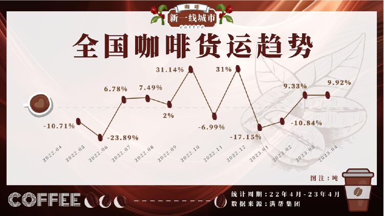 满帮数据显示,以2022年4月货运量为基准,受疫情影响,咖啡运输在4-5月一度下跌,随后略有波动,但总体处于攀升状态;10月第一波国产咖啡豆迎来最佳采摘期,咖啡运输进入年度高峰期;但受第一波采摘结束以及降温影响,11月咖啡种植进入养护阶段,运输量略有下降;12月,咖啡种植养护期收尾,咖啡生豆采摘迎来第二高峰,运输量随之骤增,环比增长再次突破30%。受春节假日影响,2023年1月和2月货运量有一定下降。进入3月,随着城市内写字楼复工复产,餐饮业的“开门红”也延展到了咖啡消费,无论是大品牌还是小门店,都感受到了浓浓暖意,咖啡运输也随之快速“回暖”。