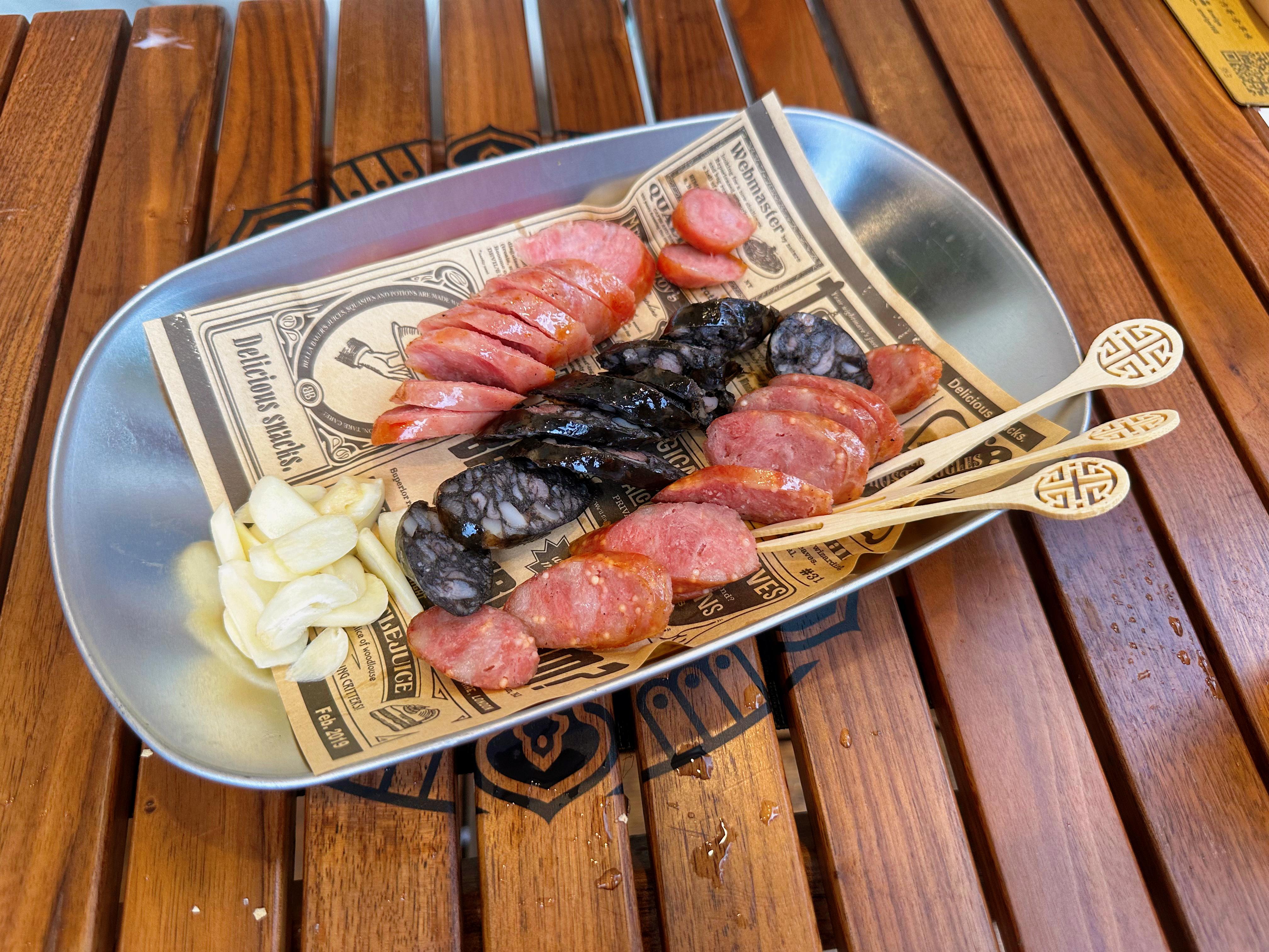 如果你喜欢大口吃肉,记得解锁香肠拼盘+冬瓜茶的吃法。香肠可以自选飞鱼籽香肠、墨鱼肠或台湾香肠组合。台湾香肠口味偏甜,可能吃几片会觉得腻——这时搭配好的蒜片就该出场了。一片肉嘟嘟的香肠夹上一片蒜,解腻同时又略微带点蒜香刺激,再喝上一口清爽的冬瓜茶,尽情享受味蕾上的夏日风情吧!