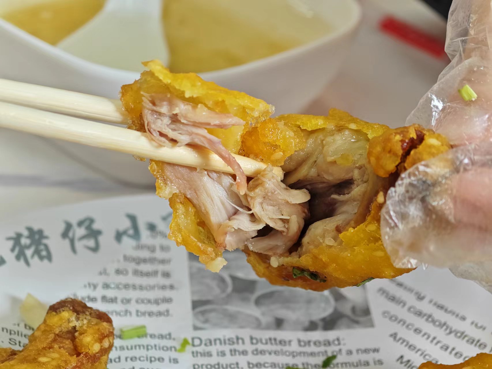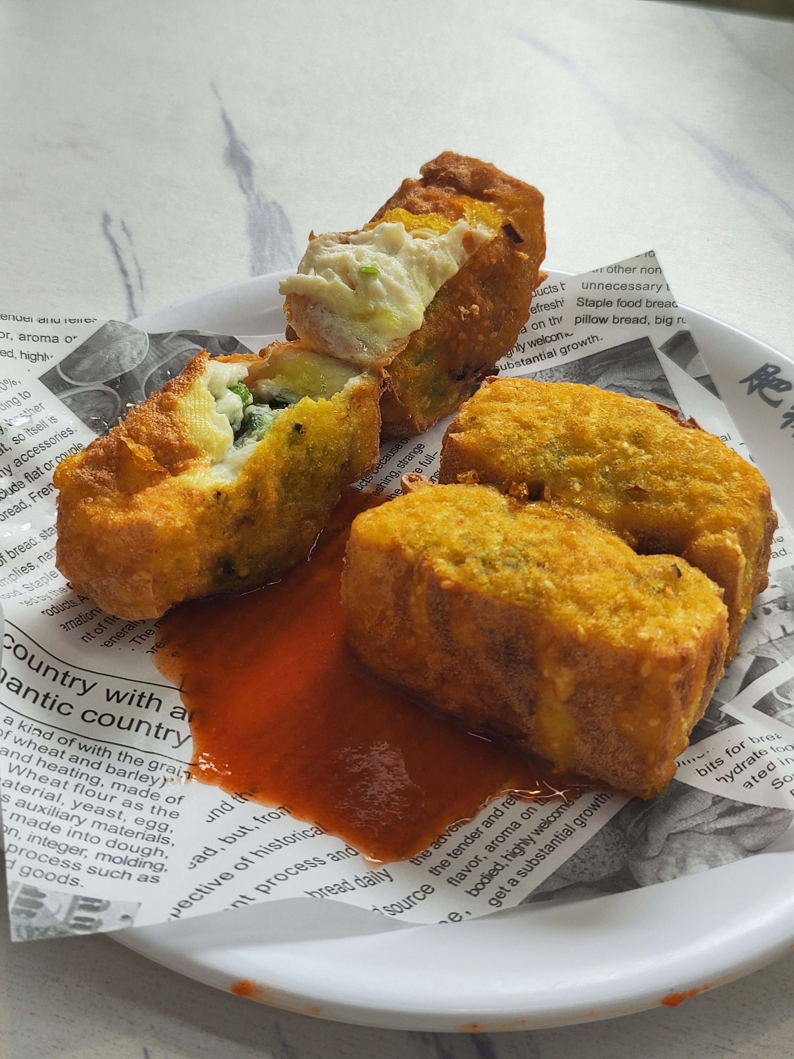 普宁蒜肉豆干,裹着粉浆的豆干外皮金黄酥脆,内里柔软润滑。与传统潮汕炸豆腐不一样的是,里面塞入了厚厚的蒜肉馅料,有点像饺子馅,沾点辣酱更入味。刚出炉的炸豆干滚烫,即使被香迷糊了,吃的时候也一定不要心急嗷!