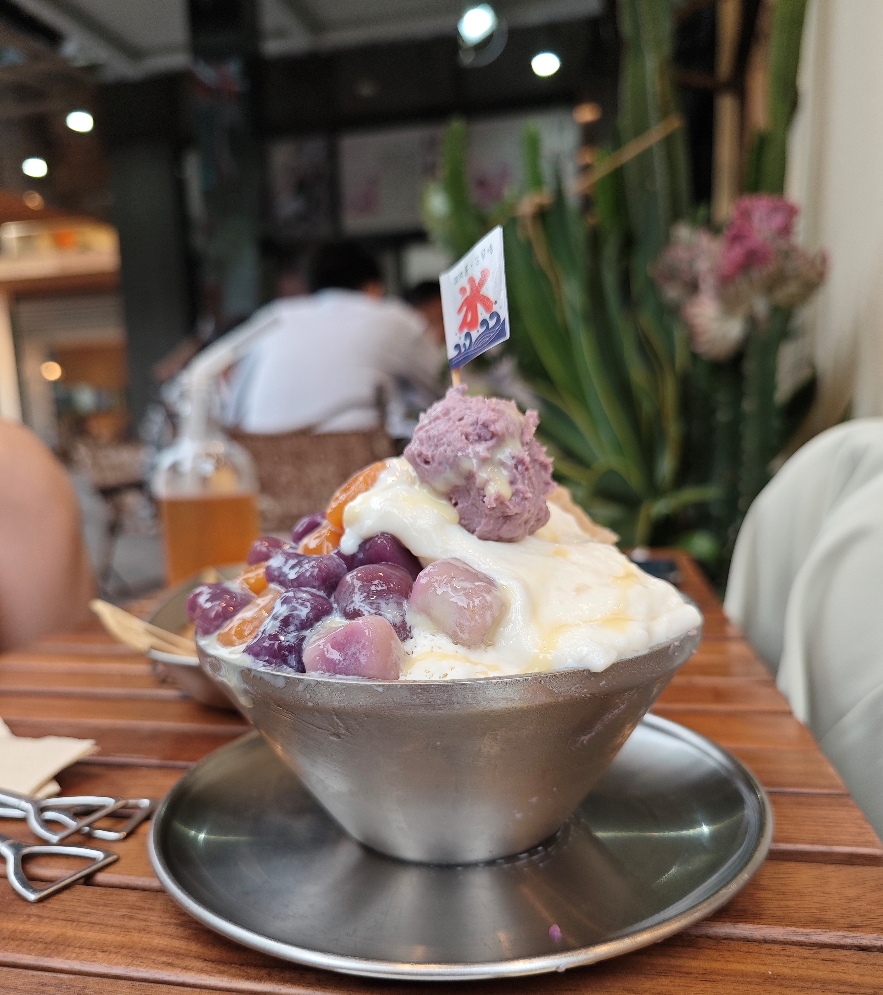 招牌是芋头麻薯牛乳冰,温热的芋头块和有嚼劲的芋圆,搭配清新细腻的牛乳冰,牛乳冰只有奶味没有甜味,满满舀一勺塞口里,顿时奶香四溢。