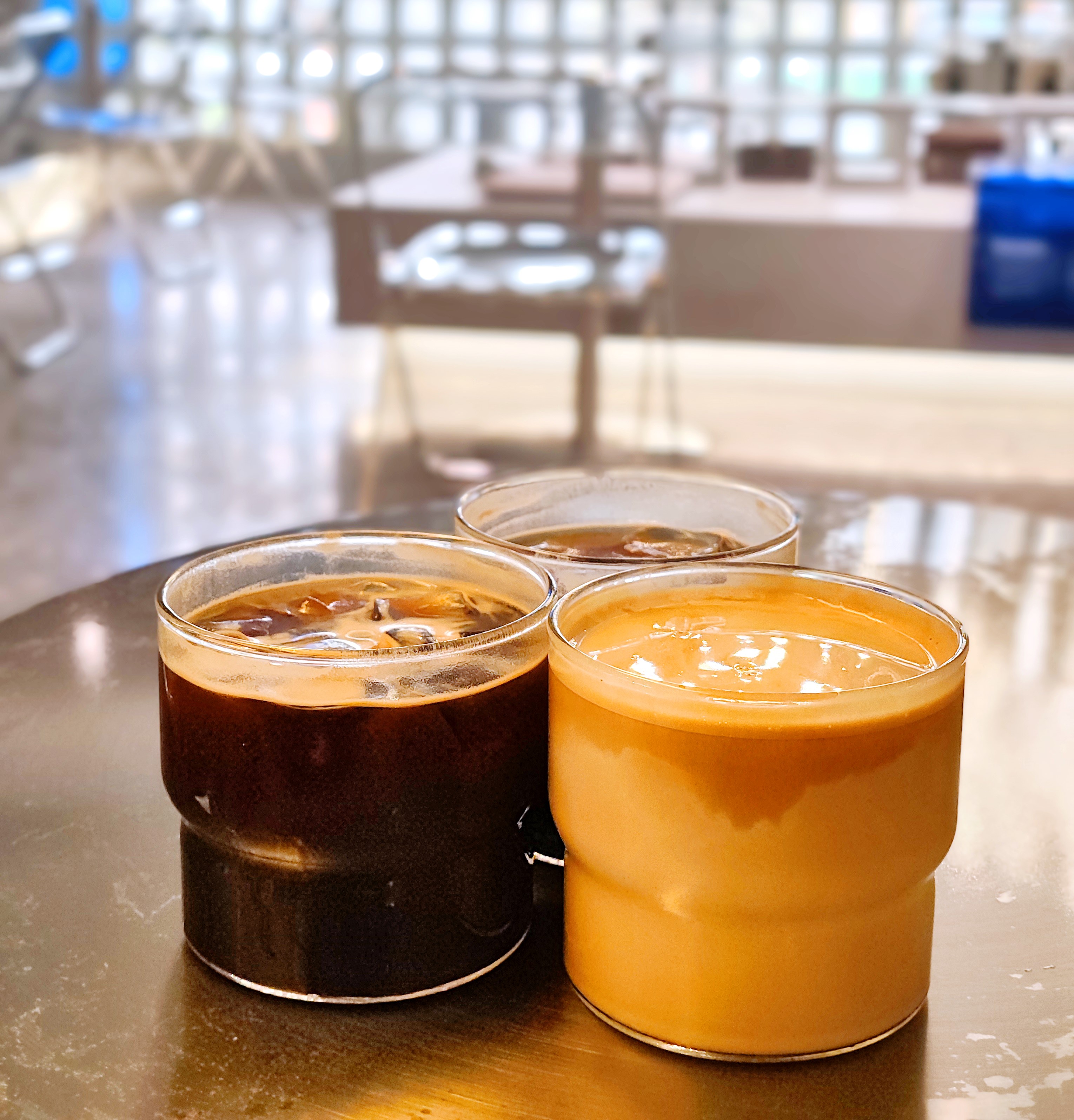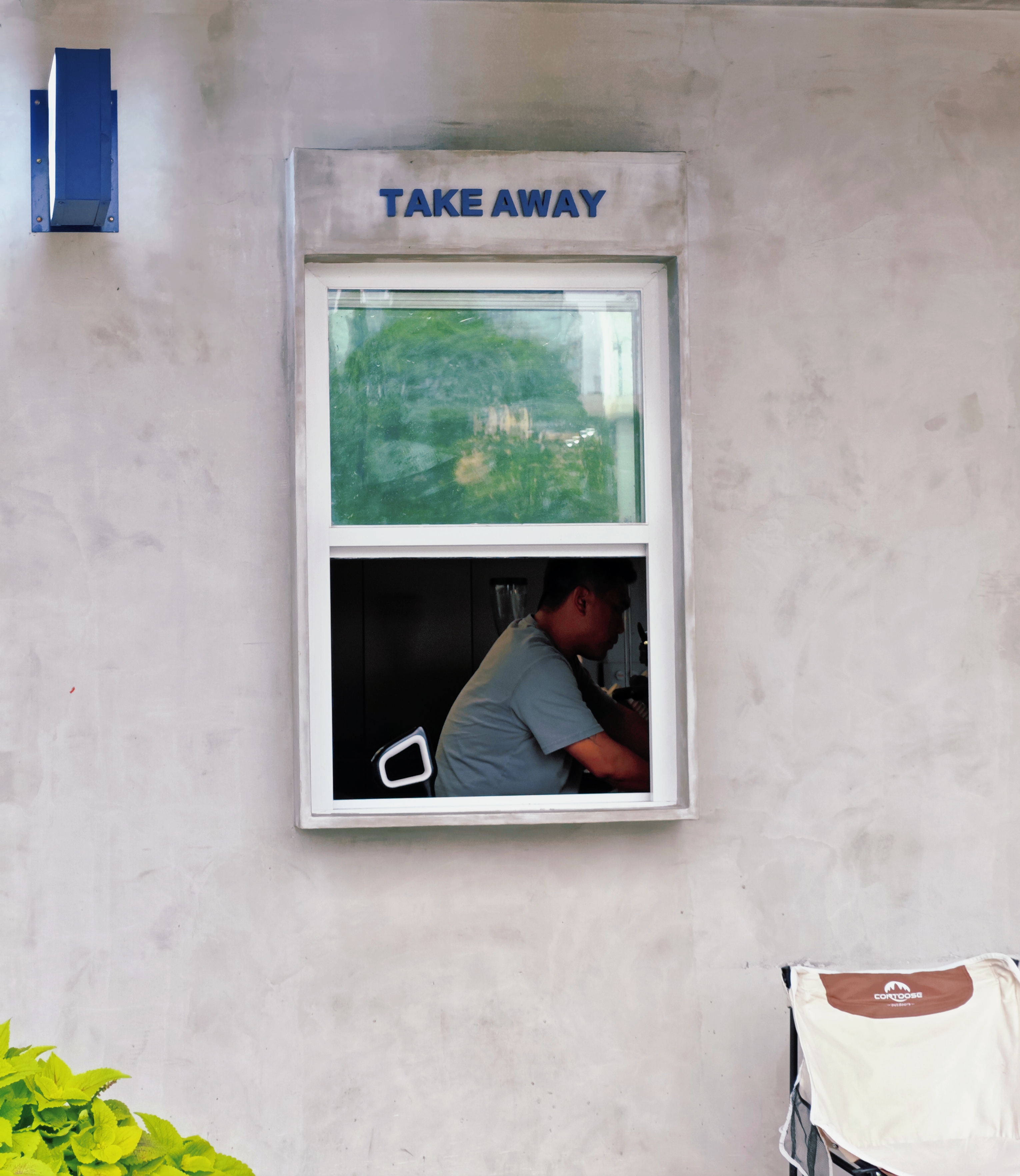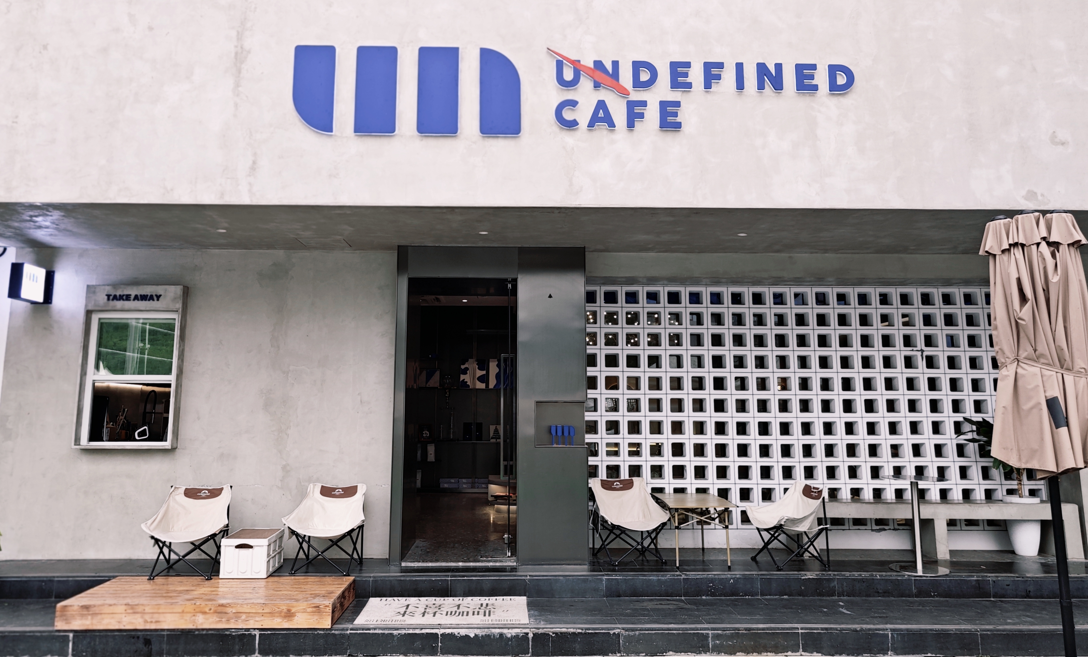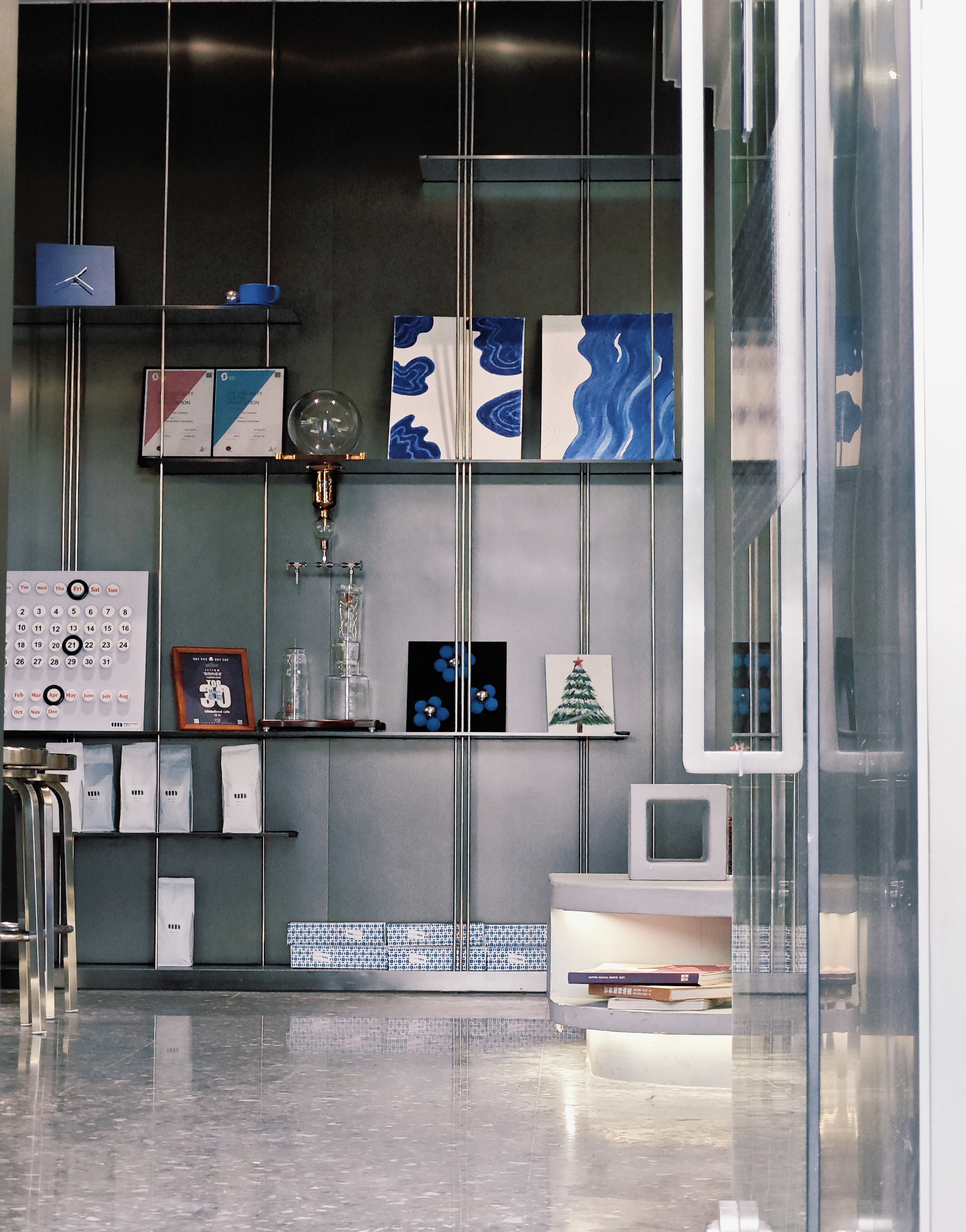 区别于主流的原木风咖啡馆装修,整个空间以灰色为基调,大胆应用克莱因蓝色块和金属元素,设计得颇有未来感,正如店门前地垫上的标语“不喜不悲,来杯咖啡”,让人迅速地平静下来。