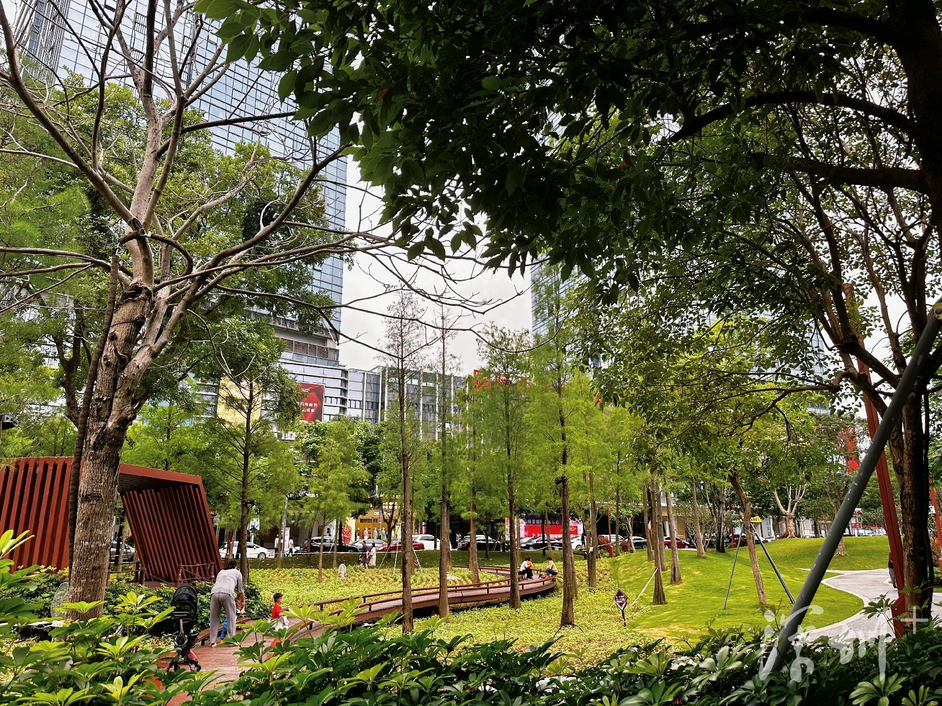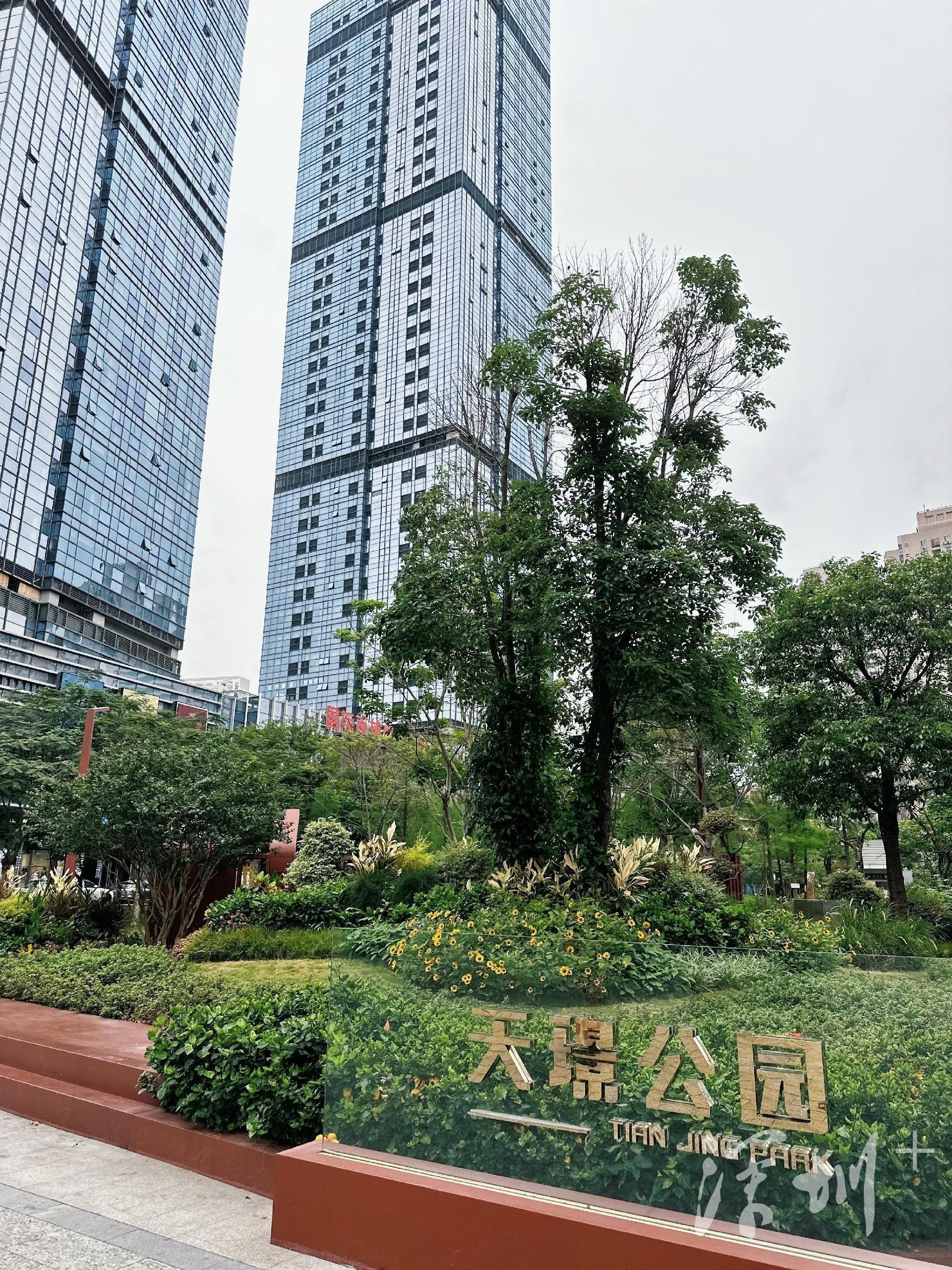 南油片区中心位置的天璟公园是不少南油市民的休闲好去处,公园内绿意盎然,人们可以在城市“森林”中散步、遛娃、谈天说地,沿线还有鲜花游径、林间树屋、星空灯艺等景观设置,这里已逐渐成为忙碌生活里的诗意一角。