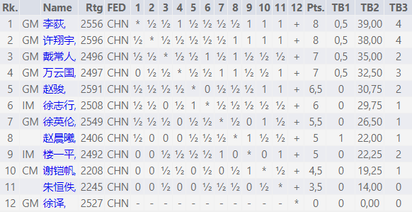 上届冠军戴常人以7分获得第三名。特级大师万云国同积7分排名第四。赵骏、徐志行、徐英伦、赵晨曦、楼一平、谢铠帆、朱恒佚分列第5~11位。