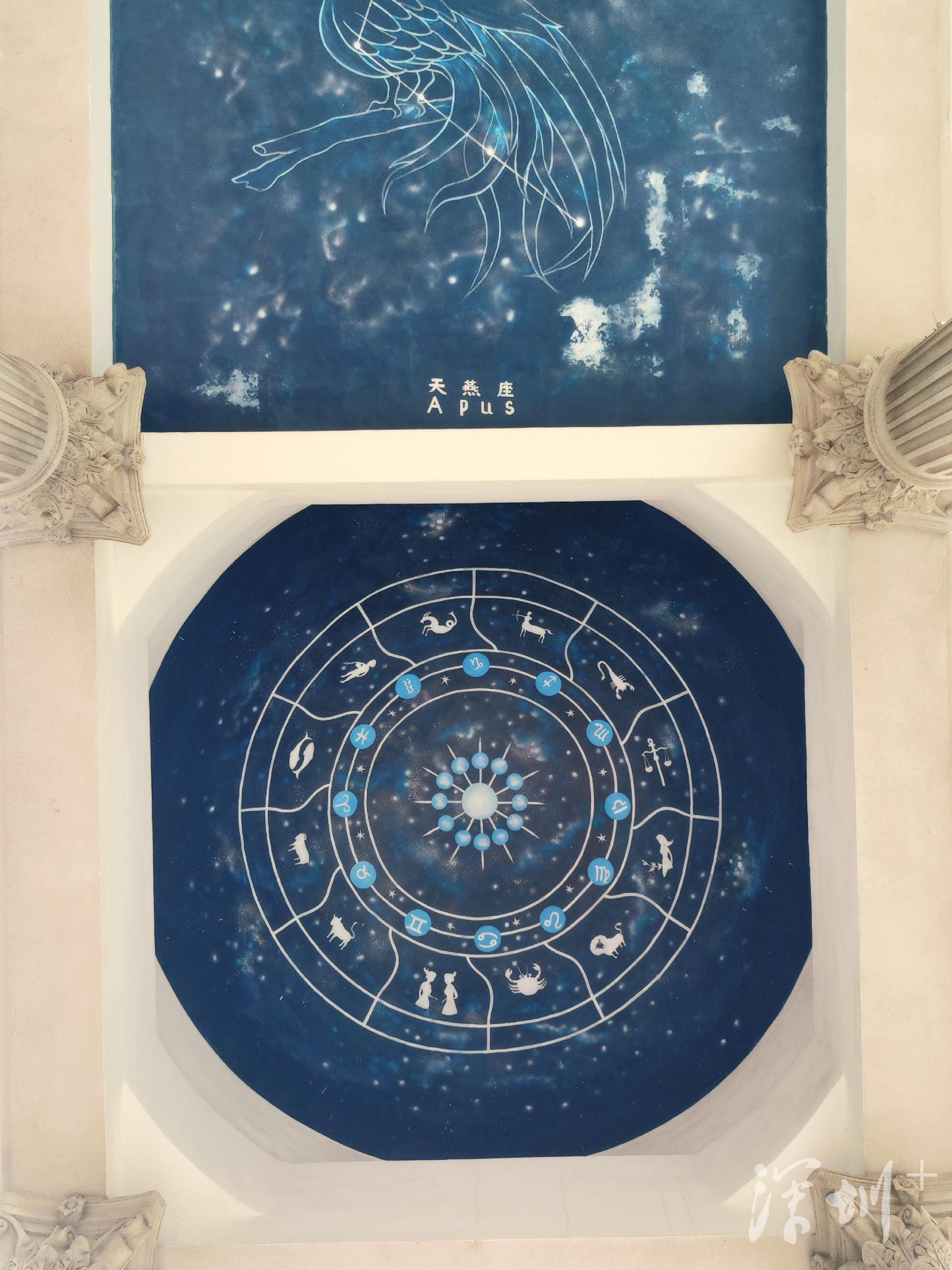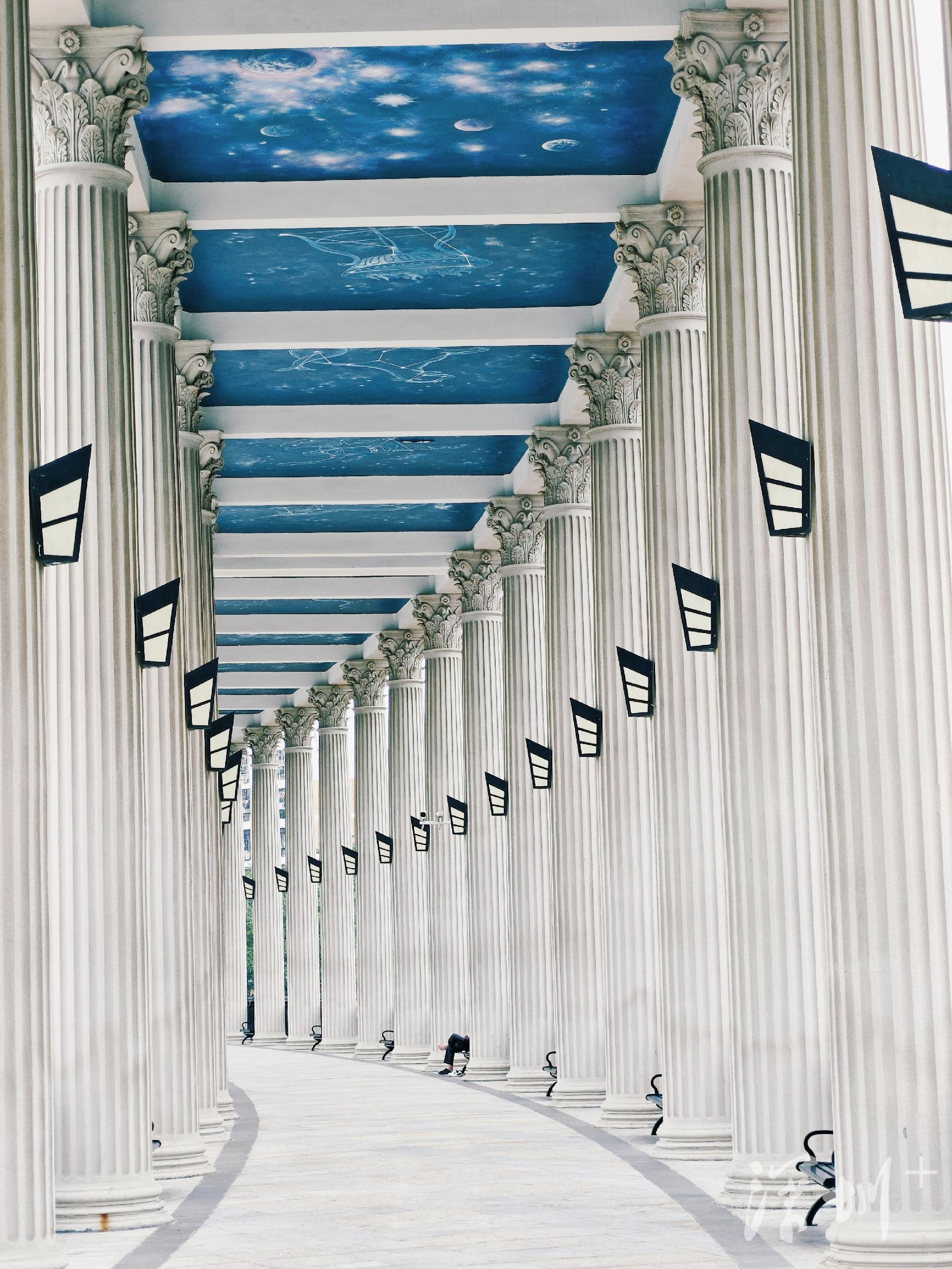 环绕着广场的是两道星座长廊,228根罗马柱雄伟伫立,天顶上绘有唯美星空图,看完你会意识到,充满想象力与戏剧性的星座,远不止耳熟能详的那十二个。凭栏仰望可见被科林斯式柱头映衬的天空,低头则能俯瞰广场全貌。