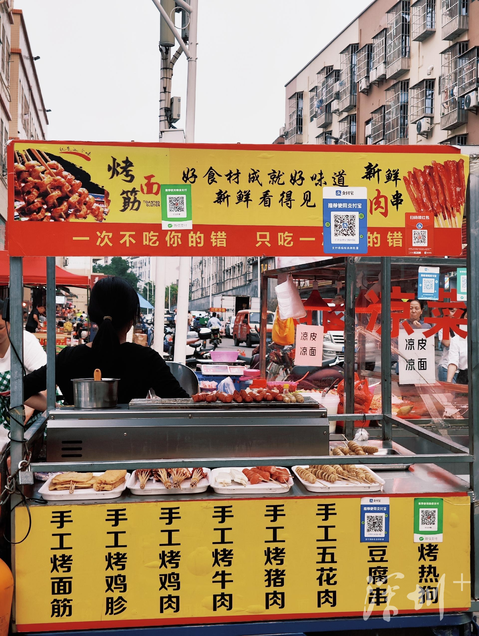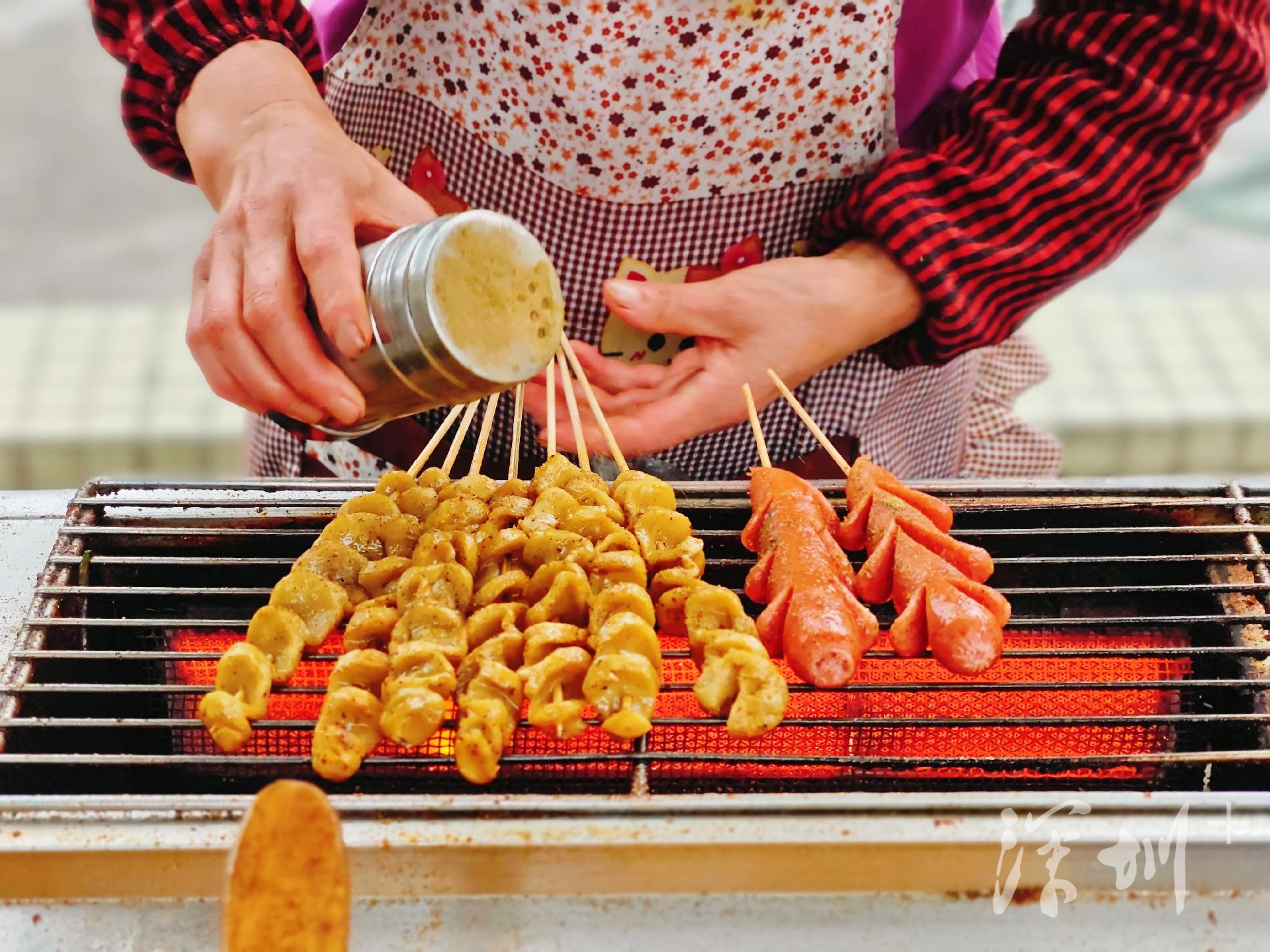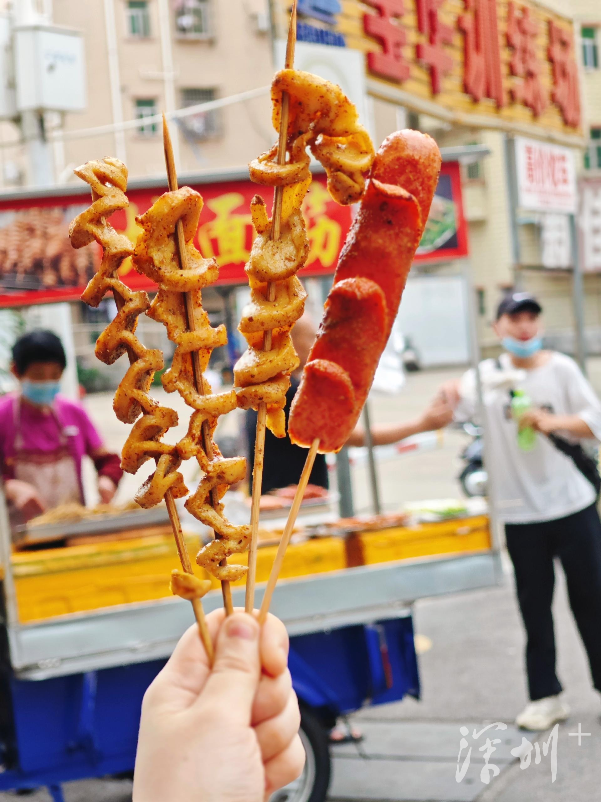 而开在小学对面的烤面筋摊位格外受欢迎,摆摊的是一对来自山东的夫妻,操着一口乡音的普通话跟我们介绍他们的王牌炸物“烤面筋”,“这个面筋是我们自己做的,好吃的哩。”烤好的面筋散发出腾腾热气,一口下去,面筋劲道有弹性,几串下肚仍不过瘾。