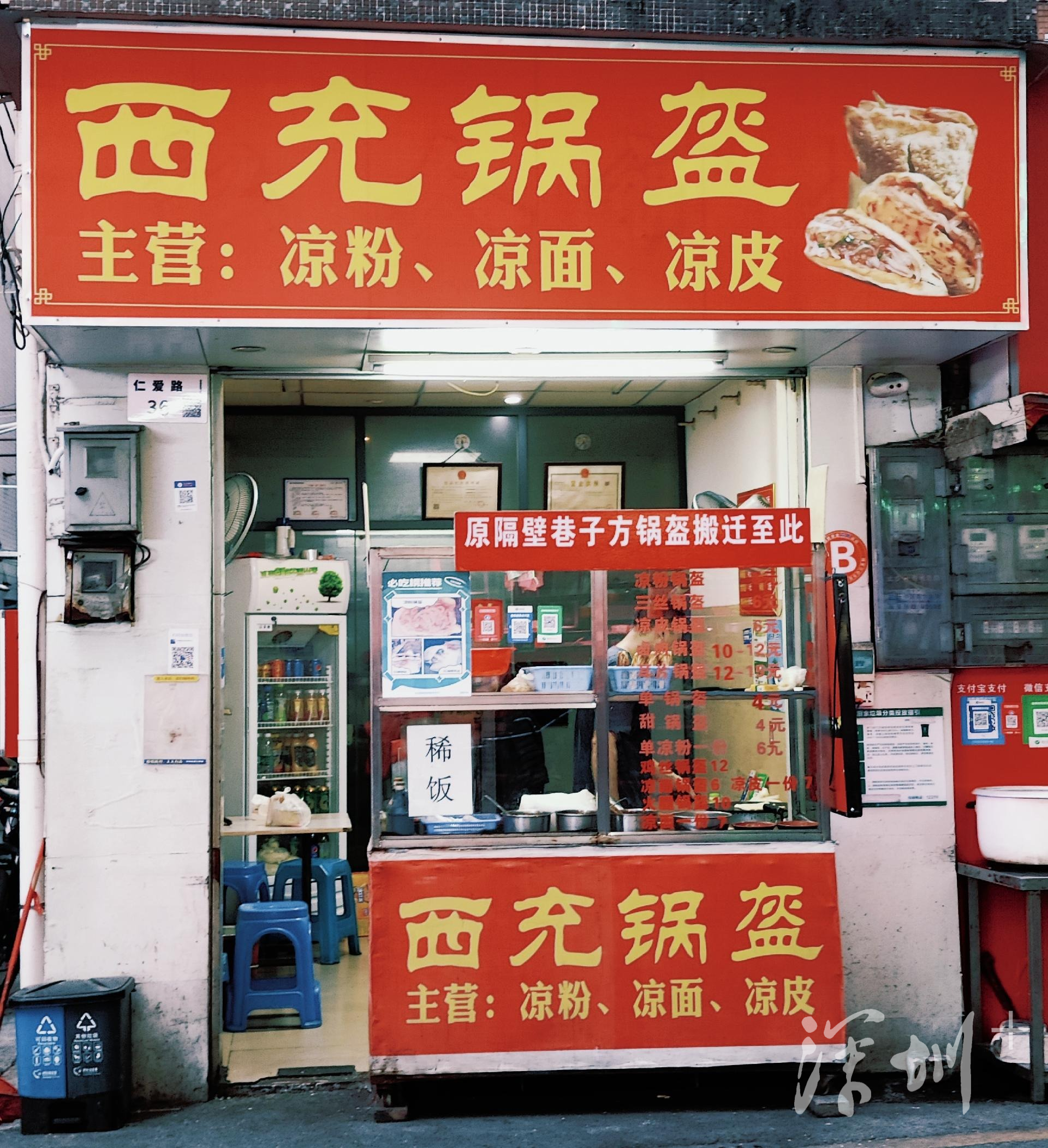 仁爱路上,聚居着很多来自四川西充的务工人员,所以西充小吃店和西充家常菜馆集中,每到饭点时间,总是挤满人,不少人是冲着方锅盔和凉面这两样特色小吃来的。心急的小朋友拿到手后,直接在路边吃得满嘴油光。