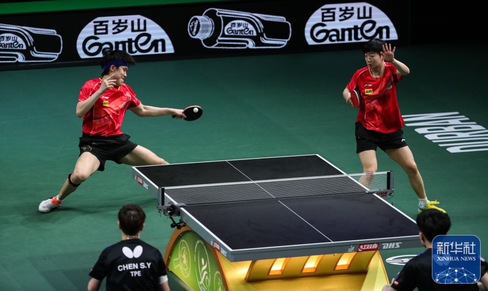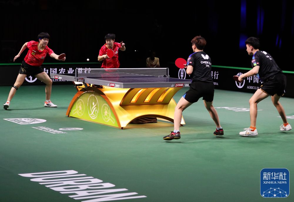 5月24日,王楚钦(上左)/孙颖莎(上右)在比赛中。新华社记者 韩旭 摄