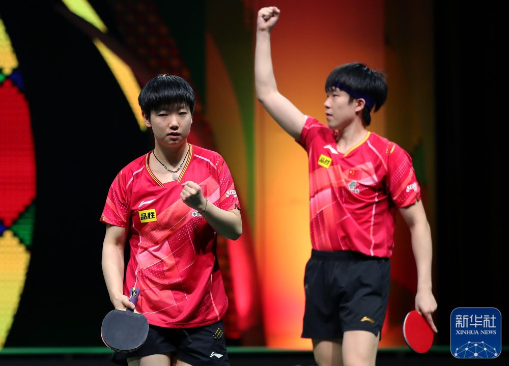 5月24日,王楚钦(右)/孙颖莎在比赛中庆祝得分。新华社记者 王东震 摄
