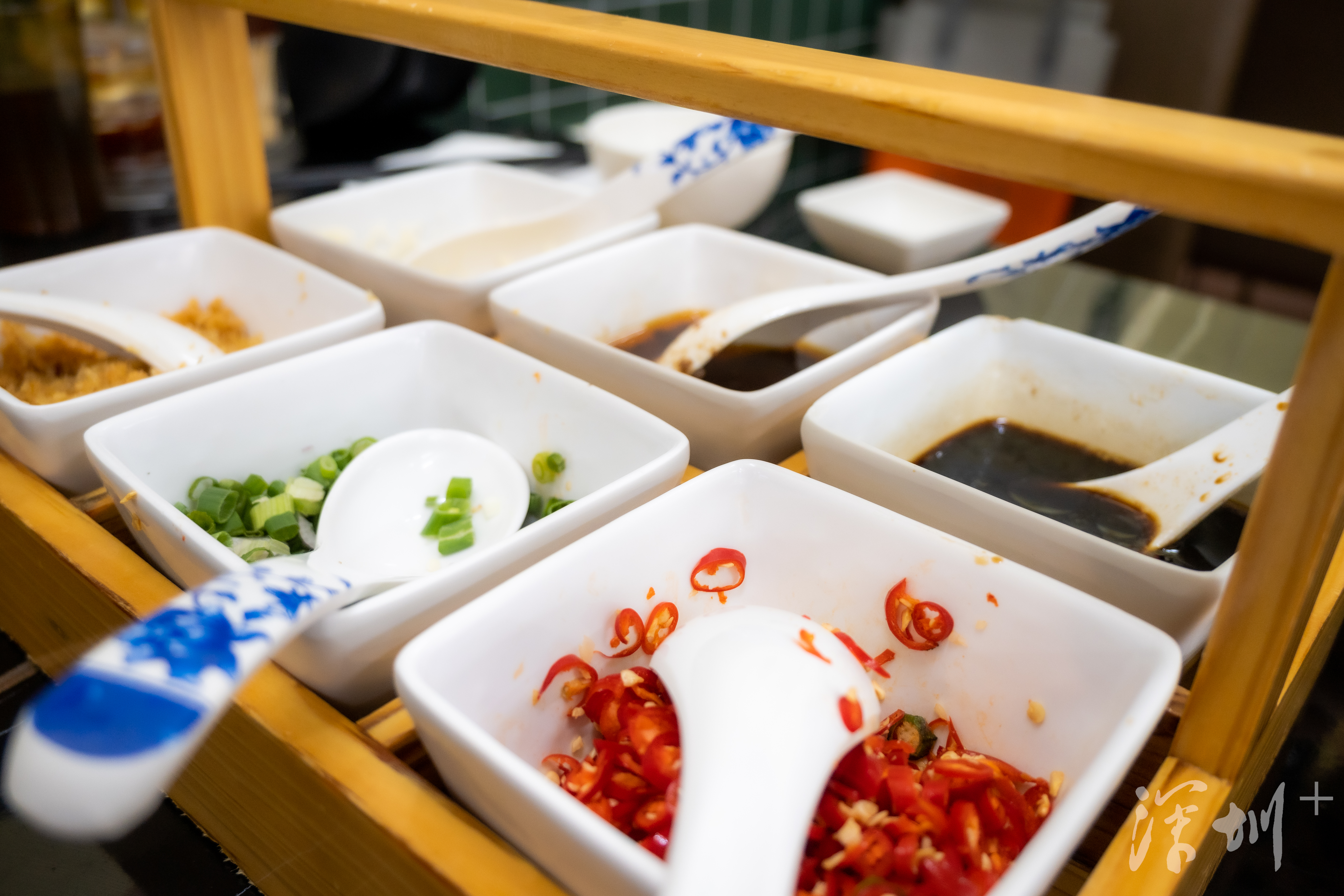 火锅还附带摆满了六宫格的调料,可以自由调出你喜爱的味道。