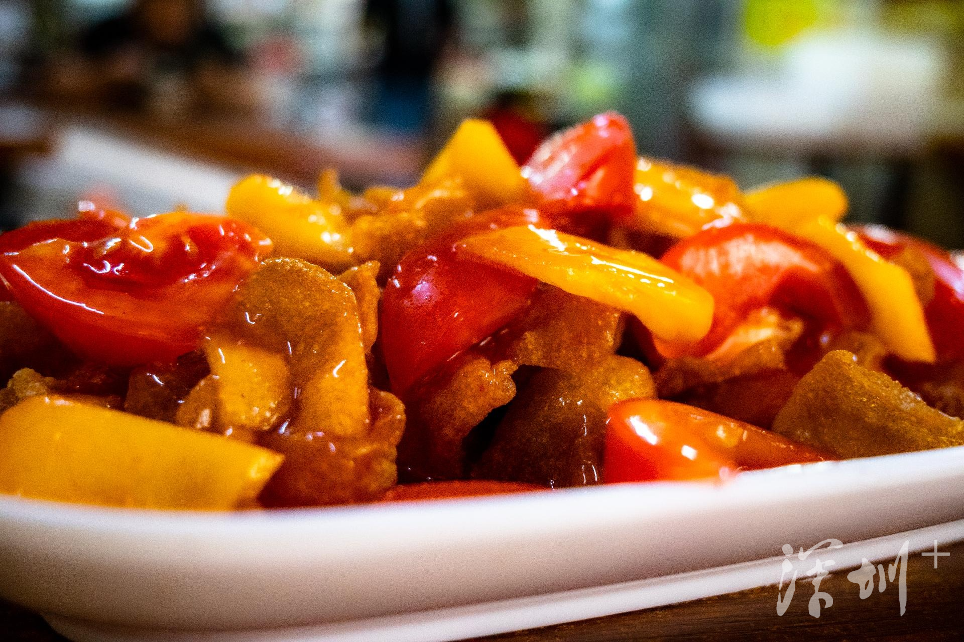 这儿还有款酸甜饺,是把炸过的饺子加以番茄酱、菠萝块翻炒,做法接近菠萝咕噜肉。裹着酸甜酱汁的炸饺像一个个小琥珀,口味非常特别。