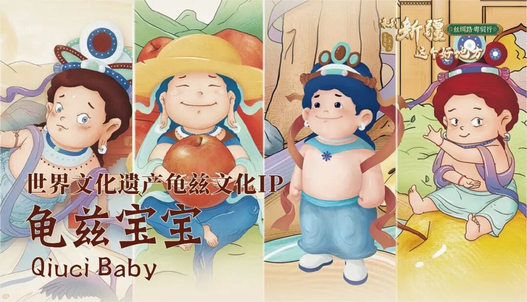 “龟兹宝宝”是通过提炼龟兹石窟佛教形象特征,结合屈铁盘丝绘画技法绘制而成。将瑰丽悠远的龟兹文化,通过创意十足的卡通形象呈现出来,通俗亲民,深入人心。通过数字化还原与创作、线上线下互动、农文旅体产业融合的形式,突破时空界限和物理限制,让消费者全方位、沉浸式、交互性地体验,让世界文化遗产走进大众生活,得以更好地传承与应用。