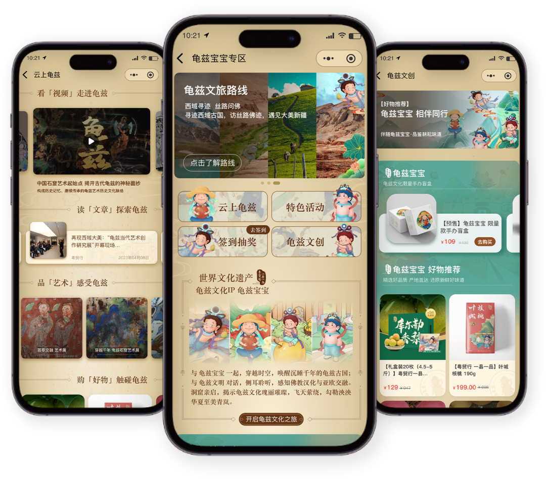 以实际行动积极响应国家文化数字化战略。通过把龟兹文化应用到农文旅体产业,以新技术、新手段、新模式推广世界文化遗产,推动龟兹文化融入国潮消费市场,以市场化激活,更好地保护、传承与应用。充分发挥龟兹文化孕育而生的“龟兹宝宝”数字文创IP与“粤贸行一县一品”品牌优势,结合系列文创、数字文创、农文创产品开发、丝绸之路文化旅学路线等形式,促进数字文化和“农文旅体”的深度融合,推广乡村旅游、乡村消费,推进乡村振兴。