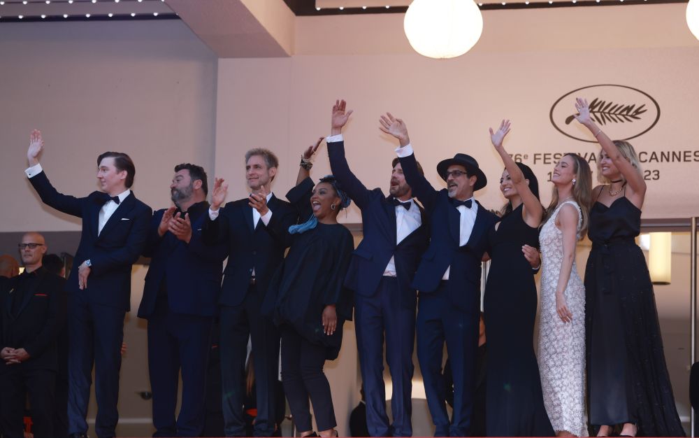 5月27日,在法国戛纳国际电影节上,主竞赛单元评委会主席、瑞典导演鲁本·奥斯特伦德(中)携众评委踏上闭幕式红毯。新华社记者 高静 摄