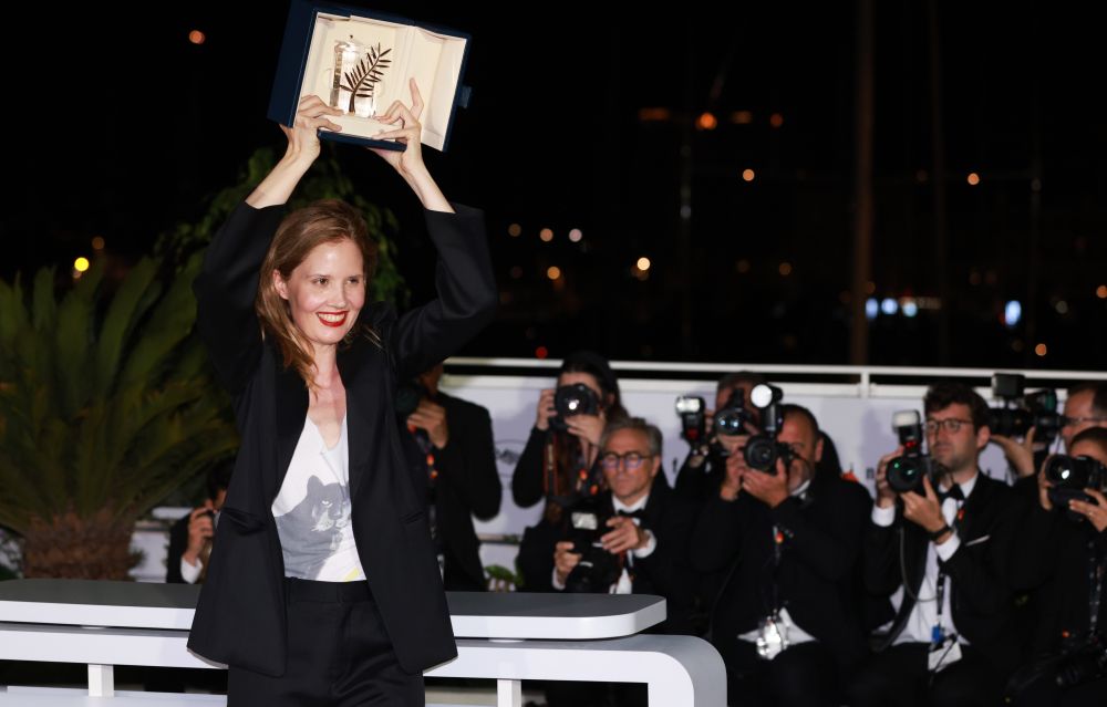 5月27日,在法国戛纳,法国导演朱斯蒂娜·特里耶展示“金棕榈奖”奖杯。新华社记者 高静 摄